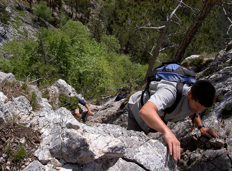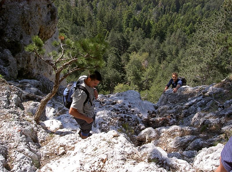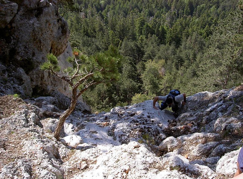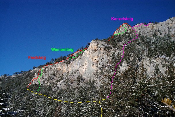 Ganz oben bietet sich der Ausstieg über den sanierten Technikersteig - vier kurze Seillängen bis 2 + - an. Siehe dazu Topo! Der Technikiersteig ist von der Schwierigkeit hier nicht schwieriger als der Kanzelsteig, aber wesentlich augsetzter!