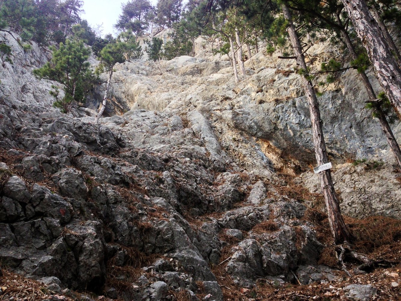 Siehe Topo. Der Steig ist durchgende mit gut sichtbaren roten Punkten markiert.