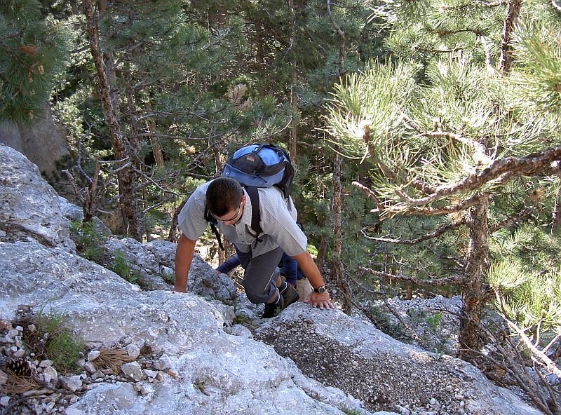 Vom Parkplatz zum "Seiser Toni" auf der bis zum Ende der Asphaltstraße. Hier führt links ein rot markierter Steig zur einer Forststraße hinauf. Auf der Forststraße 100 m nach rechts und wieder links über einen rot markierten Steig zum Wandfusssteig aufsteigen und in wenigen Schritten gerade hinauf zum Einstieg.