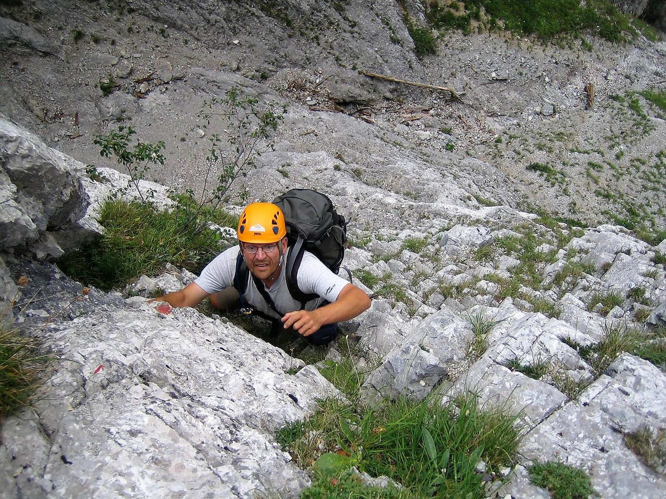 Ein Rax-Klassiker in dieser Schwierigkeit. Die Route führt anfangs durch eine Rinne und quert dann oben nach links in die Wand. Kurz vor dem Ausstieg wartet noch das Lach-kabinett, ein enger Durchschlupf. Eingesamt trotz etwas Schotter und einigen brüchigen Stellen lohnen. Die gesamte Route und der Einstieg sind rot markiert.