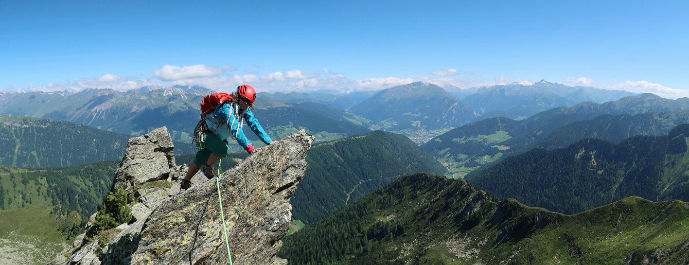 1 x 60 m Einfachseil, Klemmkeile und Friends, einige Bandschlingen (lange!) und Helm.