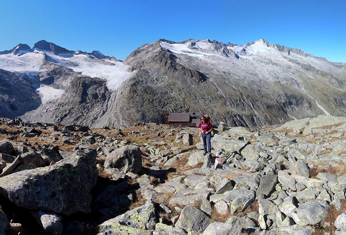 Vom Gipfel südwestliche auf dem markierten Bergweg absteigen, anfangs Blockgelände, dort wo das Gelände steiler wird, beginnt eine längere Stahlseilpassage, welcher man hinunter zu einem flachen Blockgrat folgt. Auf dem Blockgrat nach Westen, am Ende wieder steiler hinunter in das Blockgelände (auf die Markierungen achten). Man kommt wieder zur Abzweigung auf 2850 m und folgt dem schon bekannten Weg hinunter zur Kürsinger Hütte.