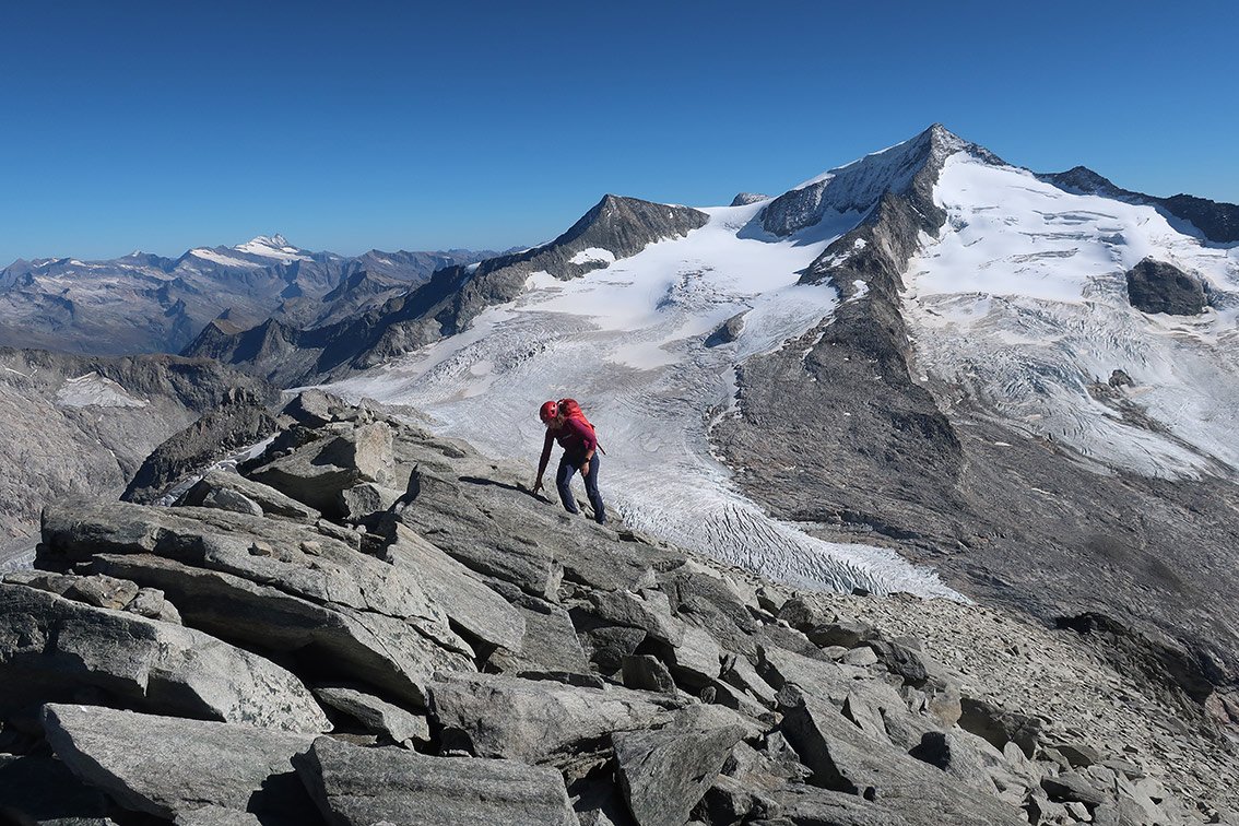 Der Südgrat auf den Keeskogel ist ein beliebter, einfacher Gratanstieg auf den Hausberg der Kürsinger Hütte. Erfahrene Bergsteiger klettern den Grat am laufenden Seil oder seilfrei. Wer die Turmvariante in der Mitte mit nimmt, muss aber etwas fester zupacken. Dieser Grat hat also sowohl für den Bergsteiger, welcher längere Touren liebt, als auch für den Kletterer etwas zu bieten. Over the top hat man aber immer ein perfektes Panorama direkt auf den Großvenediger!
