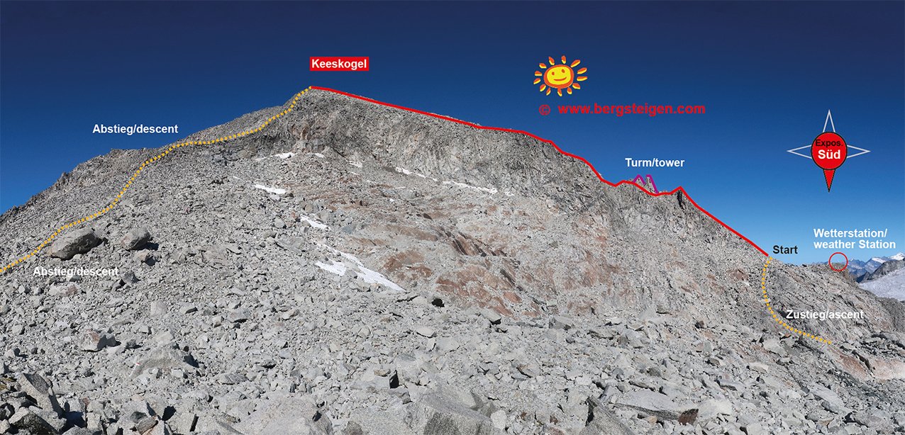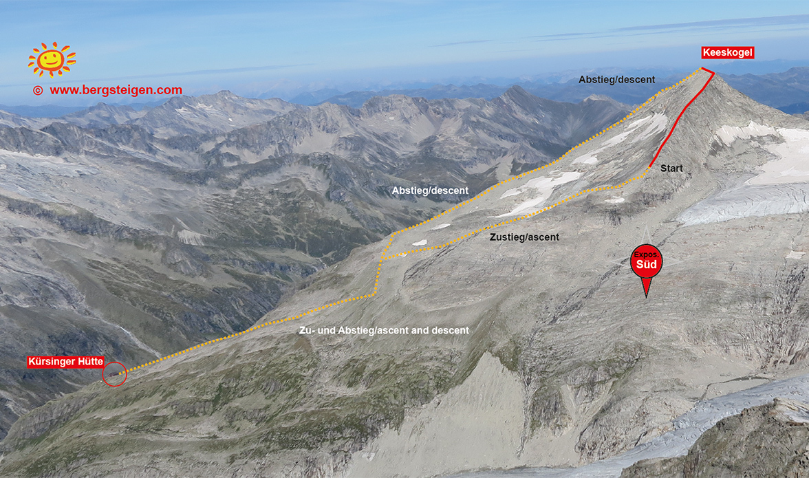 Man folgt von der Kürsinger Hütte dem markierten Weg in Richtung Keeskogel, auf einer Höhe von 2850 m sieht man den Südgrat und auch die kleine Wetterstation auf einer Kuppe unterhalb des Grates. Man geht über ein Band zwischen Platten direkt auf den Sattel zwischen Südgrat und Wetterstation zu, man kommt an einem kleinen See vorbei. Am Ende über Blockgelände hinauf auf den Blockgrat.