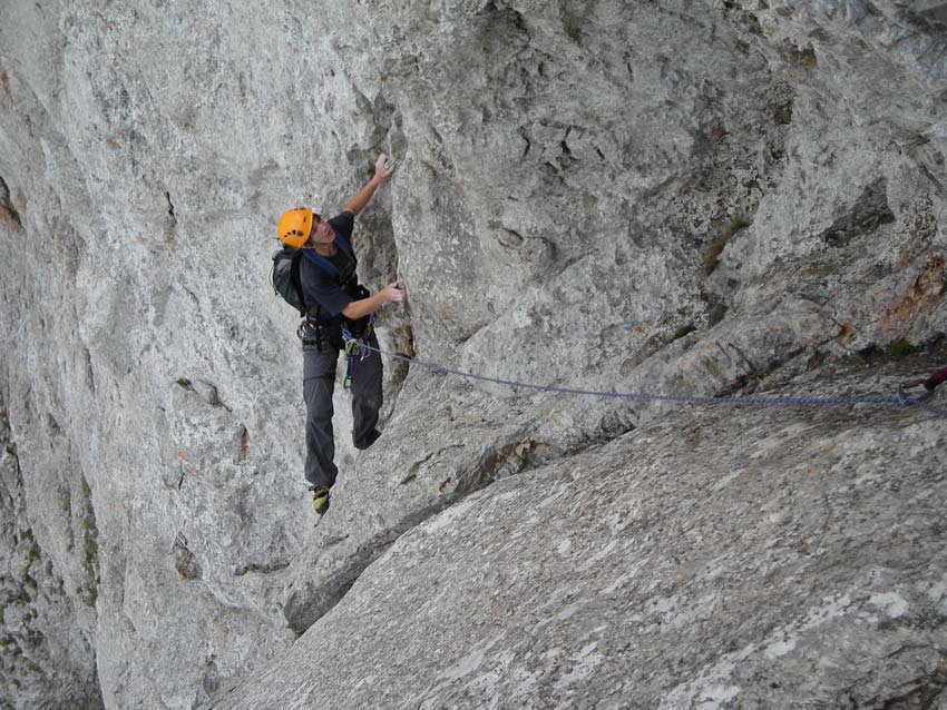 Der Einstieg befindet sich li. oberhalb einer riesigen höhlenartigen Nische bei einer kleinen Nische mit roter Erde – Bühlerhaken. Die Tour beginnt mit einer ausgesetzten Querung nach re. an gut griffiger Wand (der 1. H. ist etwas versteckt) und führt über einen Riss zu schmalem Band (35 m, 5 bis 6-). Nun steil li. hinauf zu der Rissverschneidung. Durch diese, an dessen Ende befindet sich die Schlüsselstelle, und dann re. über plattigen Fels zu Stand (30 m, 5- a0 oder 6 wenn frei). Jetzt waagerecht nach re. um eine Kante, ein wenig runter und wieder rauf zu einem großen Köpfl. Dahinter hinab zu Stand (30 m, 5- / 3, Seilreibung!). Vom Stand den weißen Riss empor und an einer Schuppe li. ansteigend, später eine Rampe nutzend zu luftigen Stand an der Pfeilerkante (25 m, 5- / 3). Von hier 3 SL re. der Pfeilerkante empor auf gr. Absatz (105 m, 3 bis 4+). ACHTUNG: Das kleine Band nach re. nicht verpassen – li. vielleicht in Summe weniger schwierig, jedoch keine Haken und kaum gute Risse zum Legen von Klemmkeilen. Es empfiehlt sich den von Türmchen und Absetzen gegliederten letzten Abschnitt in 2 SL zu bewältigen. Im Zweifelsfall eher re. haltend zur Gipfelwiese ansteigen.