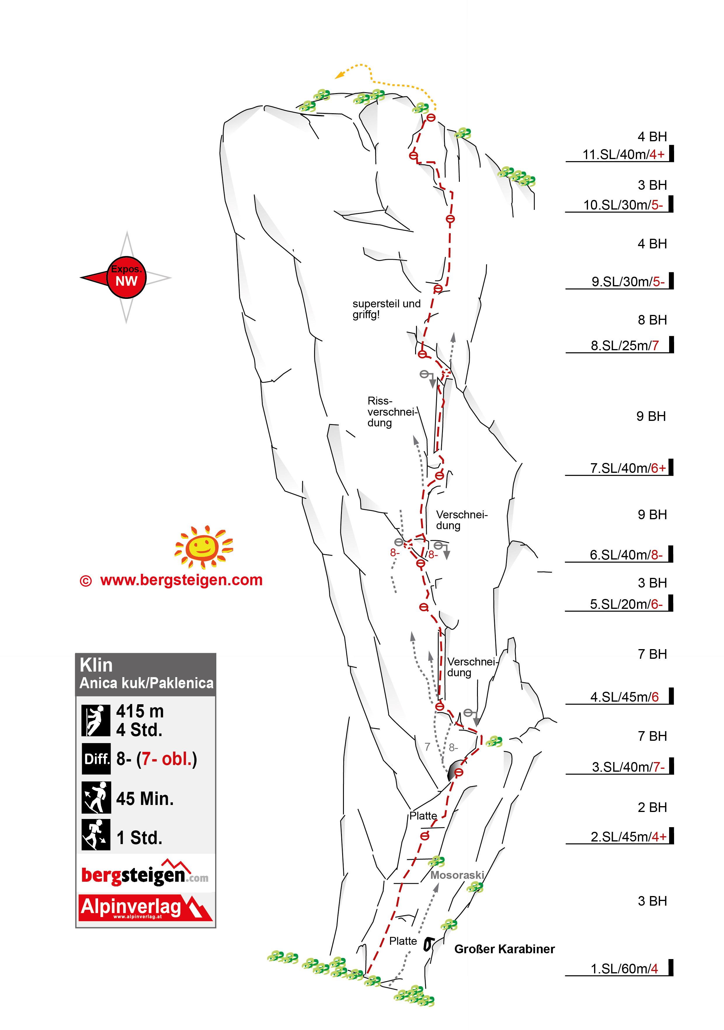 Die anspruchsvollste und gleichzeitig beste Kletterroute der Anića kuk – Trilogie (Velebitaški – Klin – Mosoraški). Die Route bietet sehr abwechlungsreiche Klettertei - primär an Rissen und Platten rechts der Riesenverschneidung. Oben wartet noch eine extrem ausgesetzte 7er Länge, die hinsichtlich Schönheit und Steilheit ihresgleichen sucht. Eine Hammer-Kletterei, die man unbedingt gemacht haben sollte!
