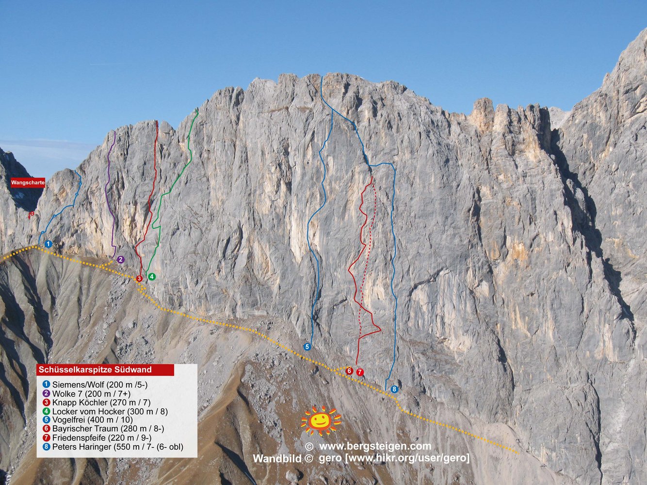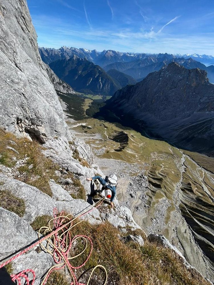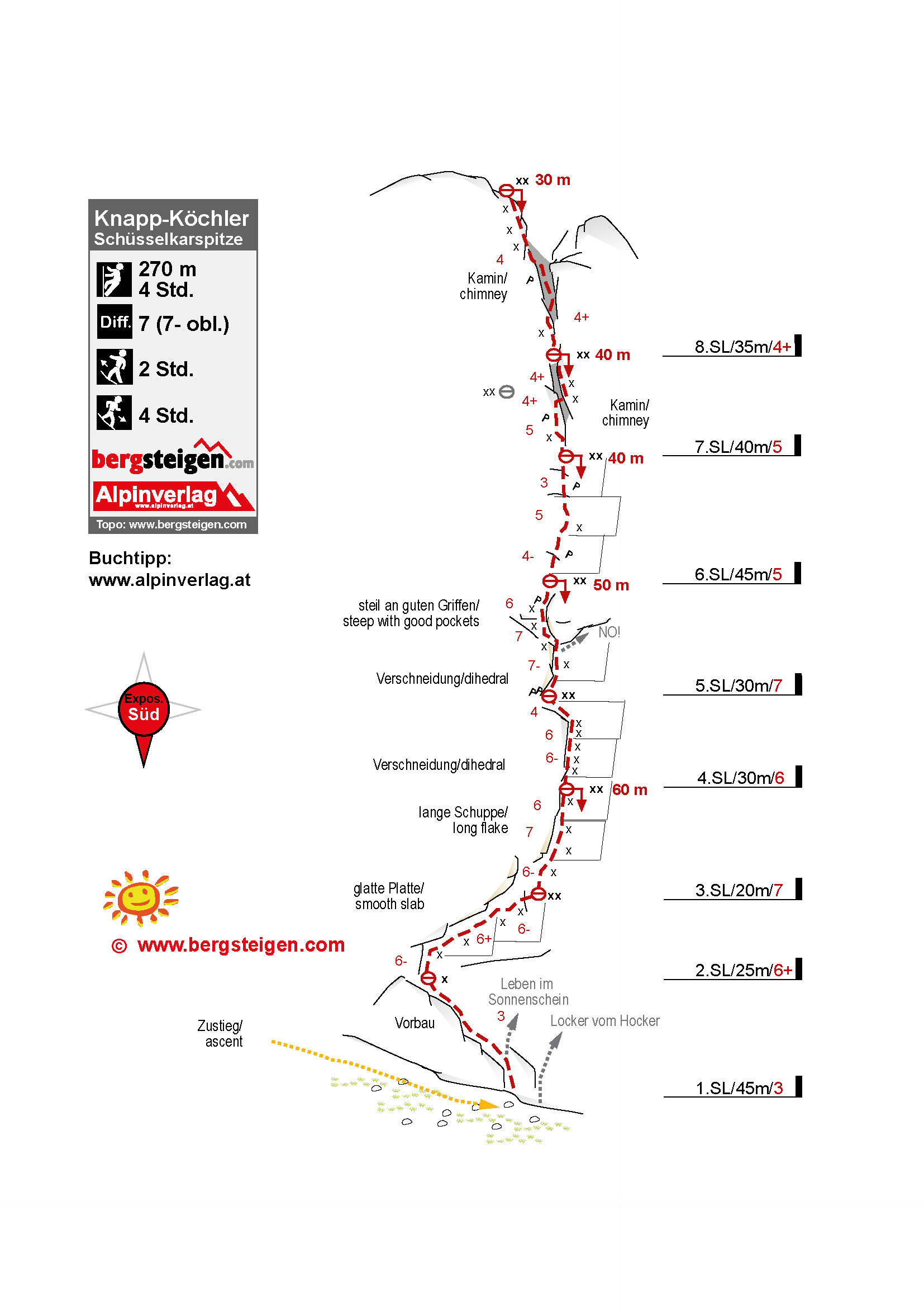 Eine wunderschöne Route im Schüsselkar. Im perfekten Fels sucht sich die Knapp - Köchler eine gut kletterbare Linie durch Platten, Risse und Verschneidungen. Die schweren Längen sind dank der Sanierung recht gut abgesichert, in den leichten Längen stecken wenig Haken. Für Kletterer, die sich im 7. Grad wohlfühlen, eine wirklich empfehlenswerte Route.