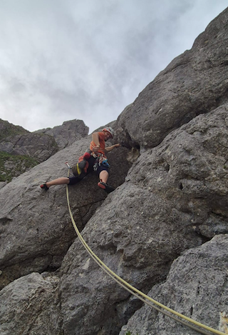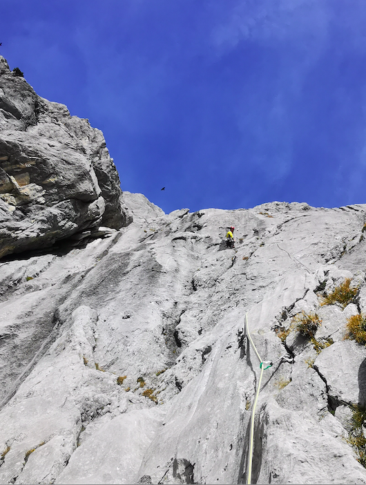 Eine Coole neu Tour an der Kopfkraxen, die einen leichten alpinen Charakter aufweist. Eine abwechslungsreiche und homogene Route mit überwiegender Wand- und Plattenkletterei. Es ist aber auch die ein oder andere Verschneidungen und Wasserrille vorhanden. So ähnlich wie die Clear Water. Es wird meist im festen und Wasserzerfressen Fels geklettert, aber auch für alle hater es gib vereinzelt schroffen und Grass Bänder in der Route. (;