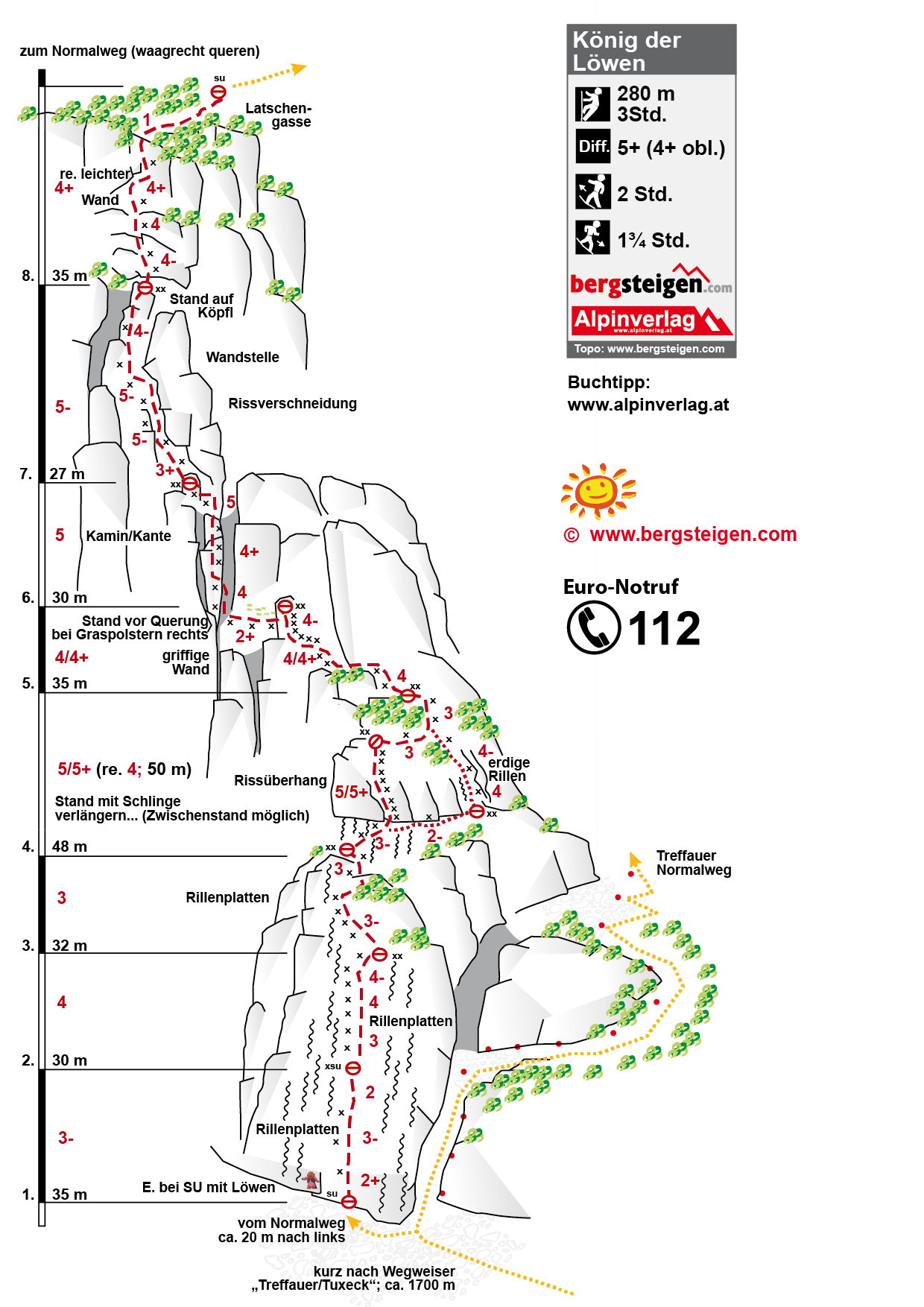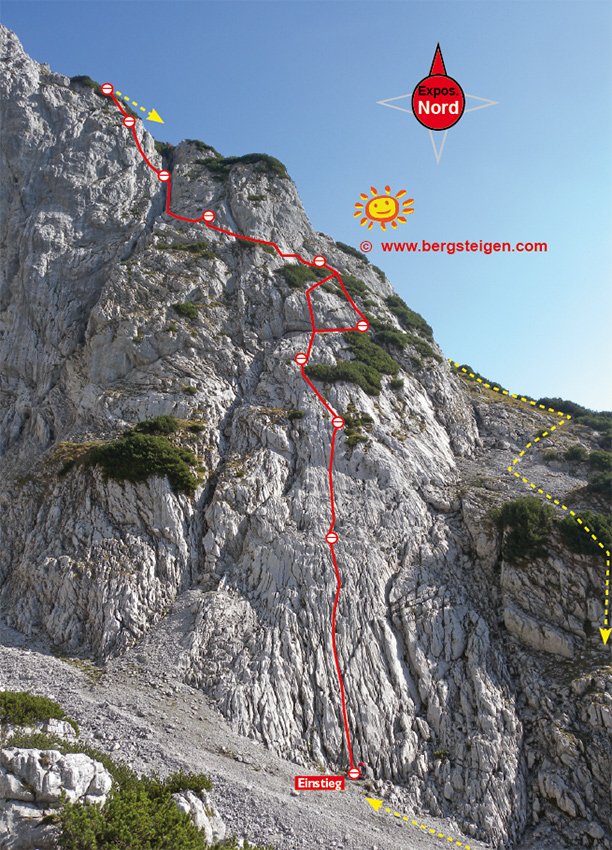 Eine Passage 5/5+, zwei Seillängen 5 bzw. 5-, sonst leichter. In der Mitte ist statt der 5/5+ rechts eine Var. (4) möglich.