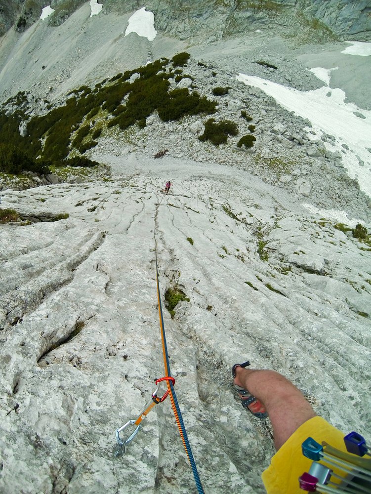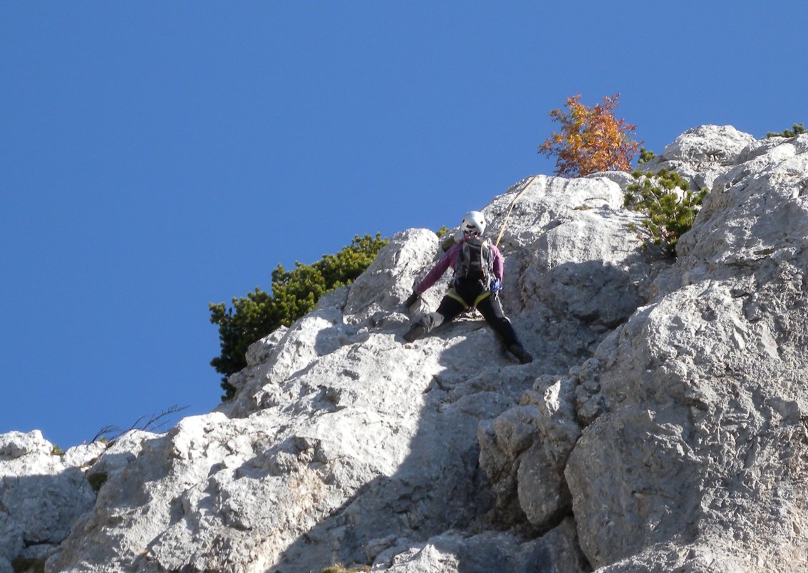 Mit Helm klettern, da Gämsen und Kletterer in der Tour Steinschlag auslösen können. VORSICHT, bei Schneelage im Frühjahr - der Abstieg befi ndet sich in einer gefährlichen Lawinenzone (Achtung, auch Nassschneelawinen!). Die Tour liegt erst am Nachmittag in der Sonne.