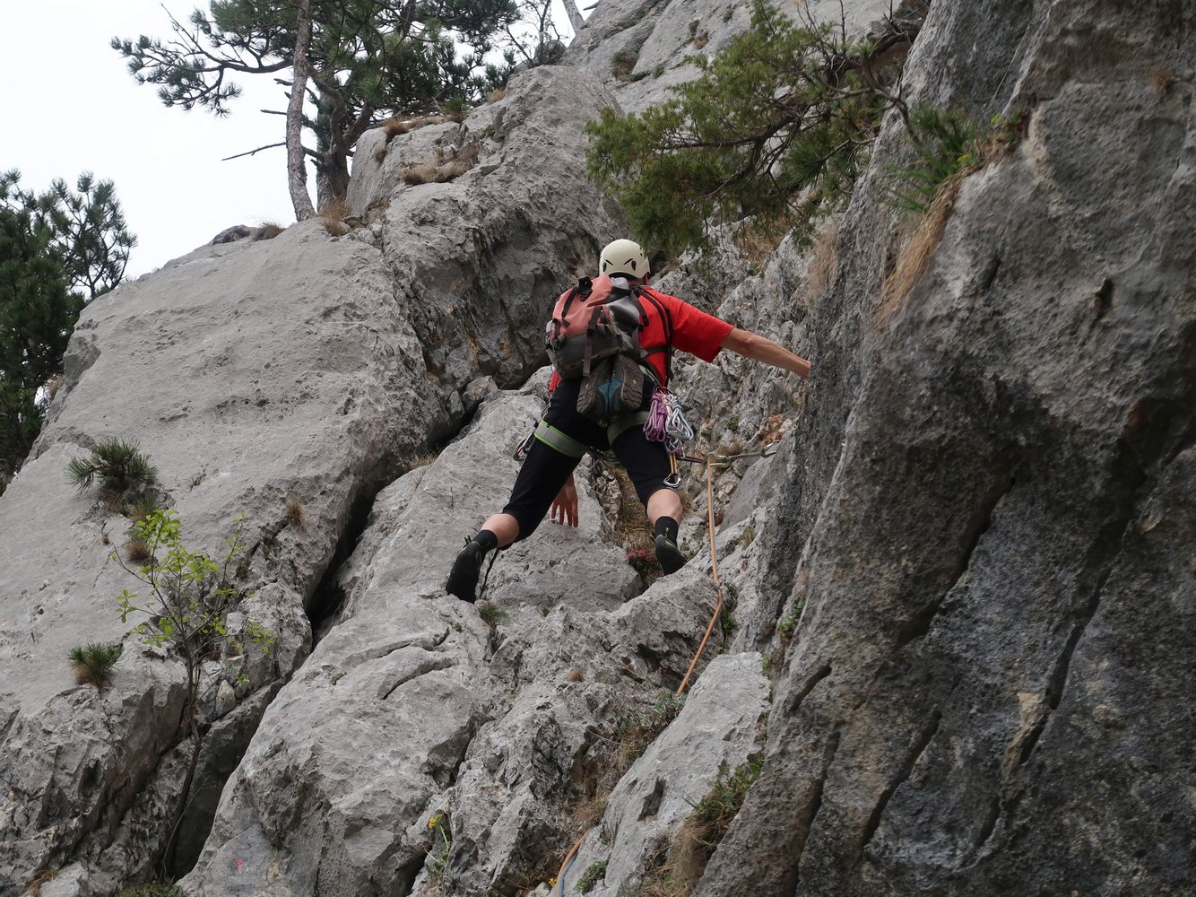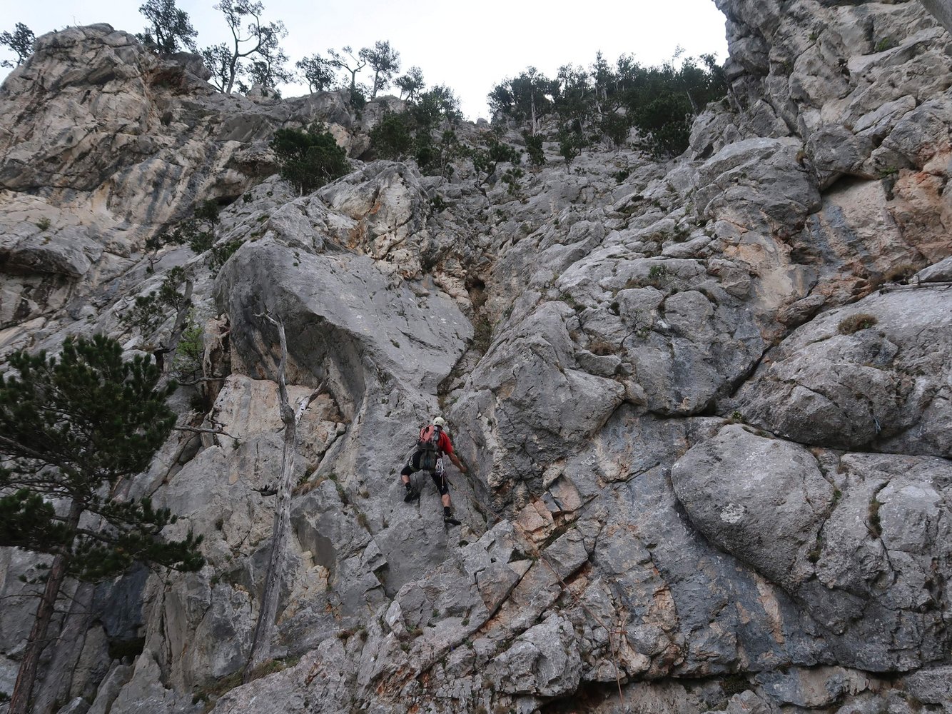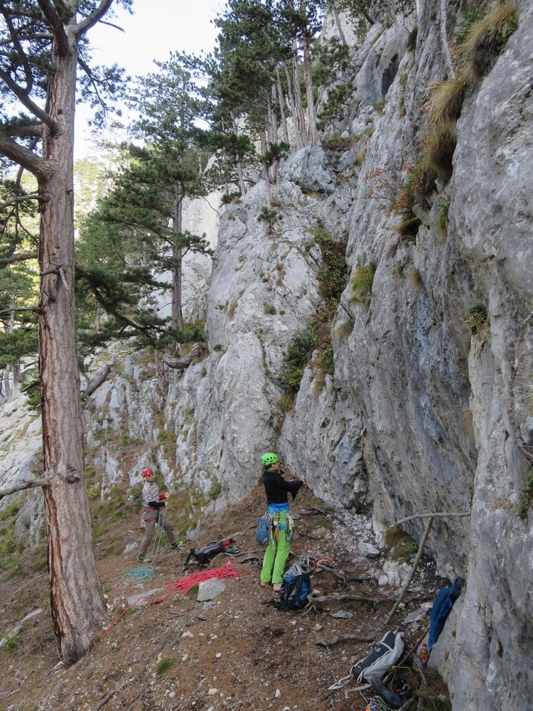 Tour wurde saniert und mit zusätzlichen Bolts ausgestattet, daher gut mit Bolts, Normalhaken und Sanduhrschlingen gesichert, dazwischen auch größere Hakenabstände, Stände an Bäumen.