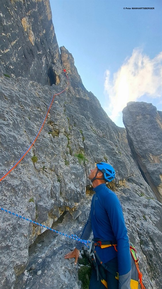 L4- IV+: Senkrecht rauf entlang einer Schuppe, dann rechts im Riss weiter zum Standplatz.