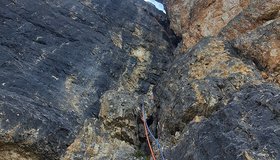 Ein aufregender Klassiker am Pilastro di Misurina- eine interessante, alpine Tour! Wohl die erste dort in dieser Wand- Erstbegehung durch P. Mazzorana und M. Camozzini 1941. Entsprechend spärliche Absicherung mit sehr wenigen NH. Sehr guter Fels- coole „old school“- Kletterei!