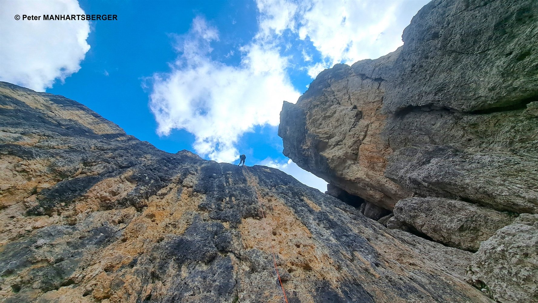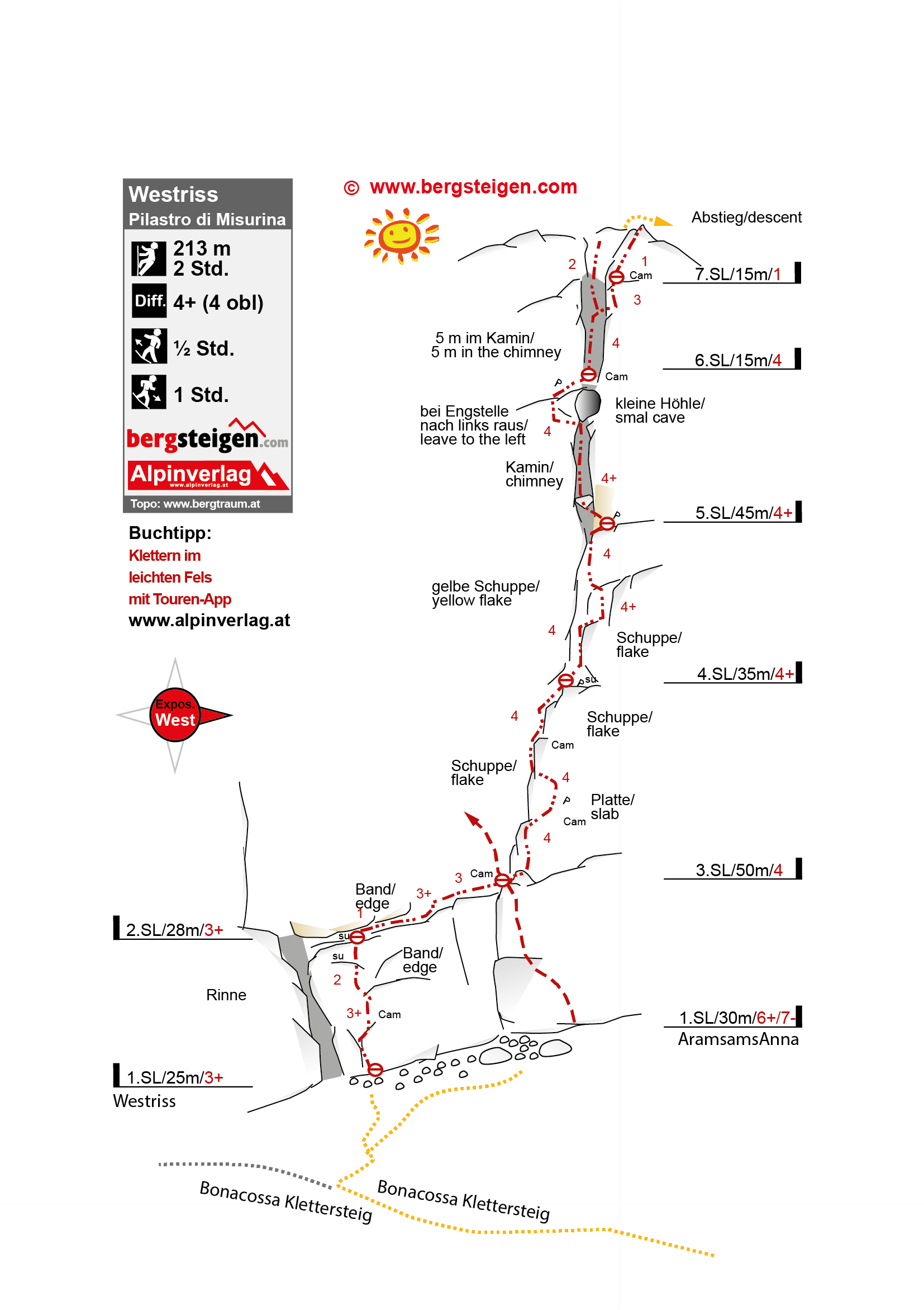Die SL 5 ist fantastisch steil und ausgesetzt. Der Originaleinstieg kann wenige Meter Richtung Süden über die erste Seillänge der alpinen Sportkletterroute: „AramsamsAnna"- 6a (Metallschild beim Einstieg) umgangen werden. Sehr lohnend!