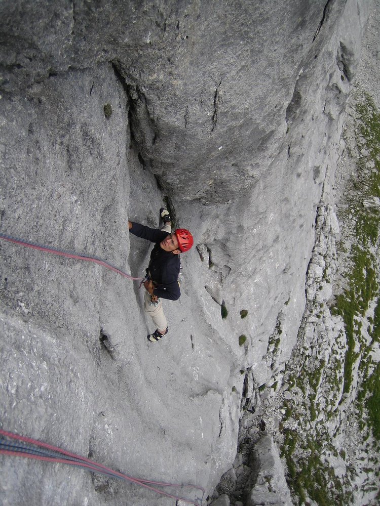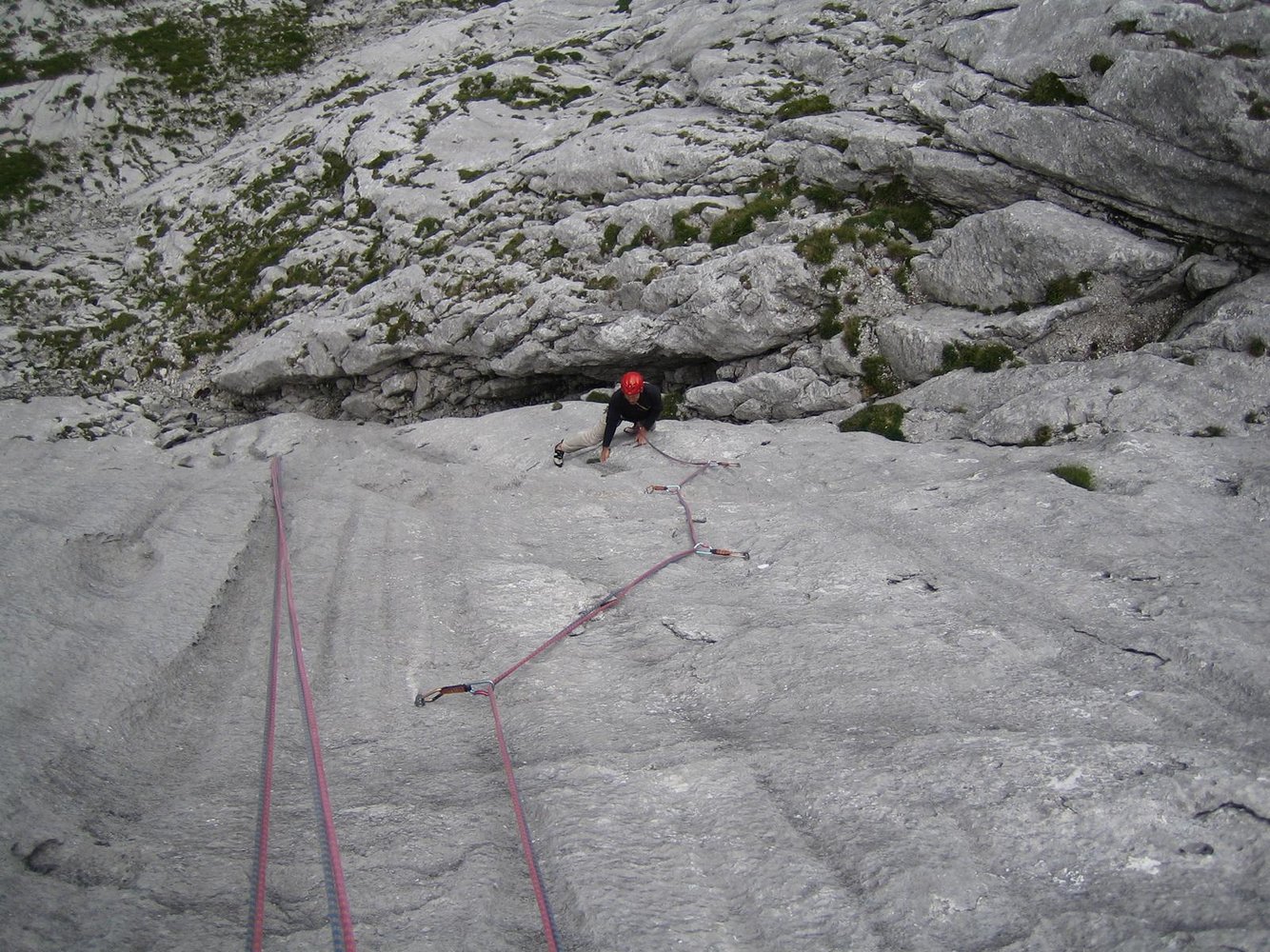 Großartige Tour durch kompakten Plattenfels, mit kniffligen Einzelstellen. Die letzte Seillänge ist leicht und unlohnend, man seilt daher am besten davor 2 x ab (siehe Topo).