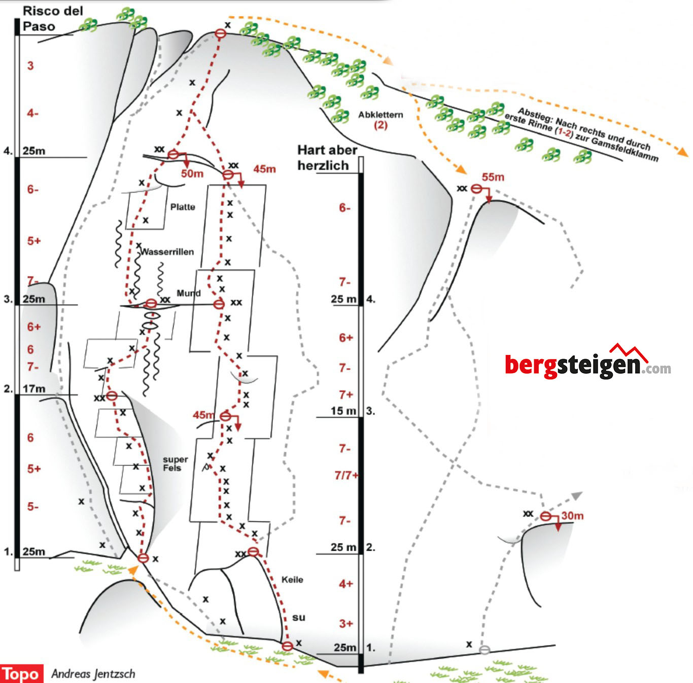 Wie Nördliche Südostwand, oder besser vor der letzten Seillänge 2 x über die Tour „Hart aber Herzlich“ abseilen (siehe Topo).