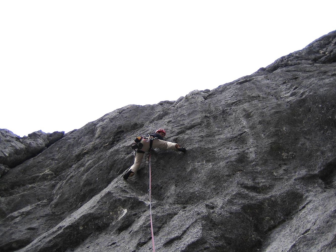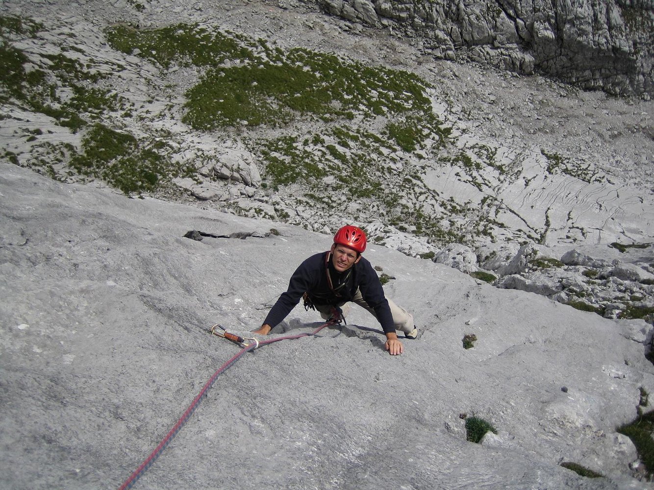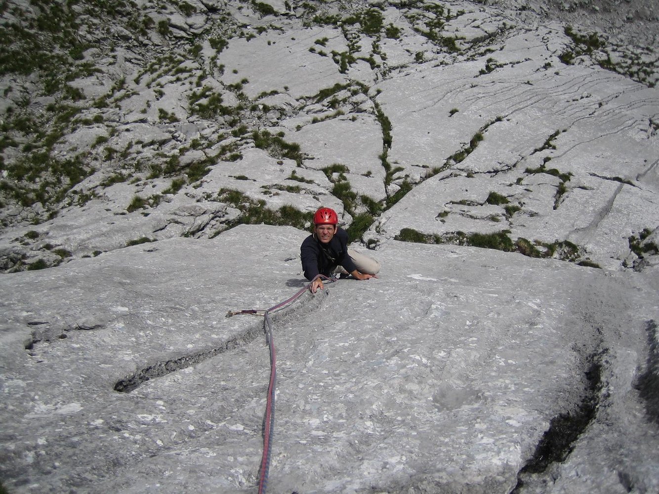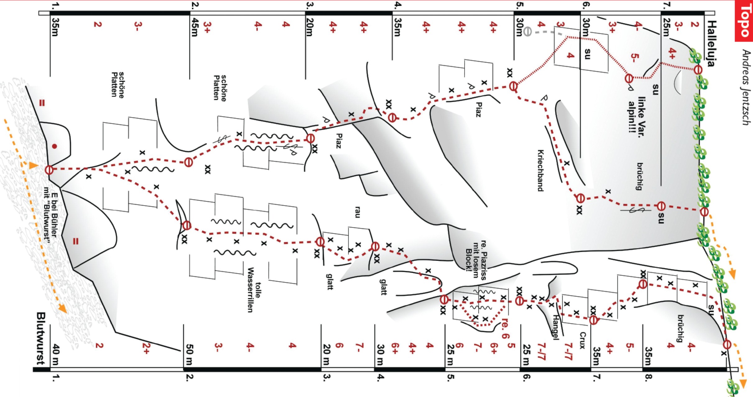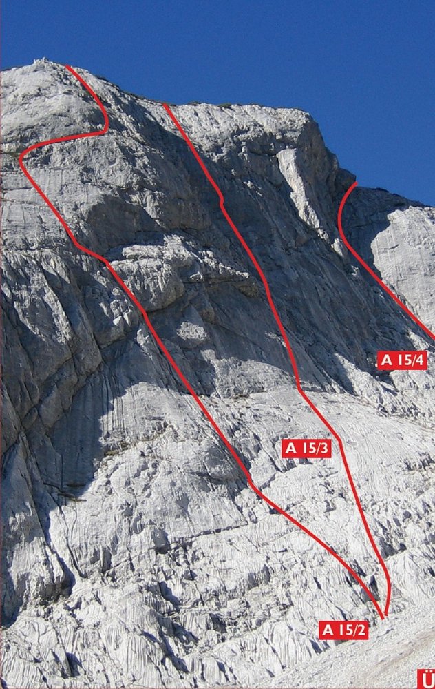 Wegen des losen Gesteins auf keinen Fall über die Tour abseilen, wenn noch andere Seilschaften in der Wand sind!