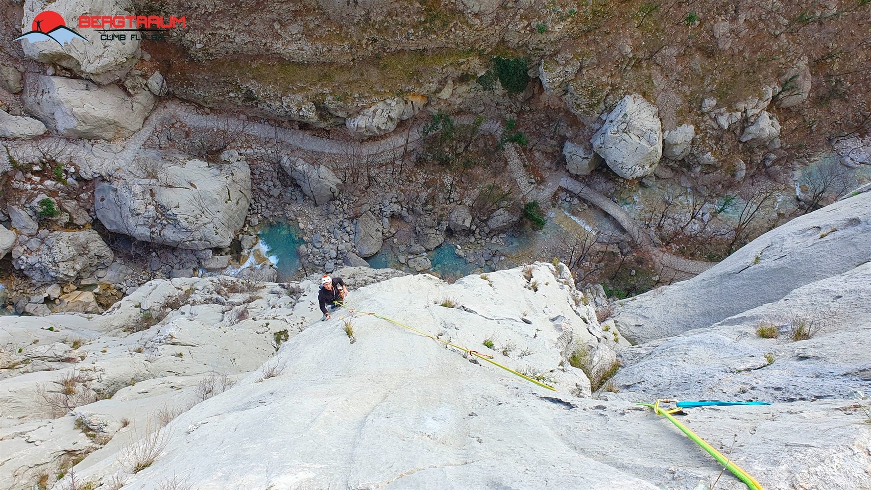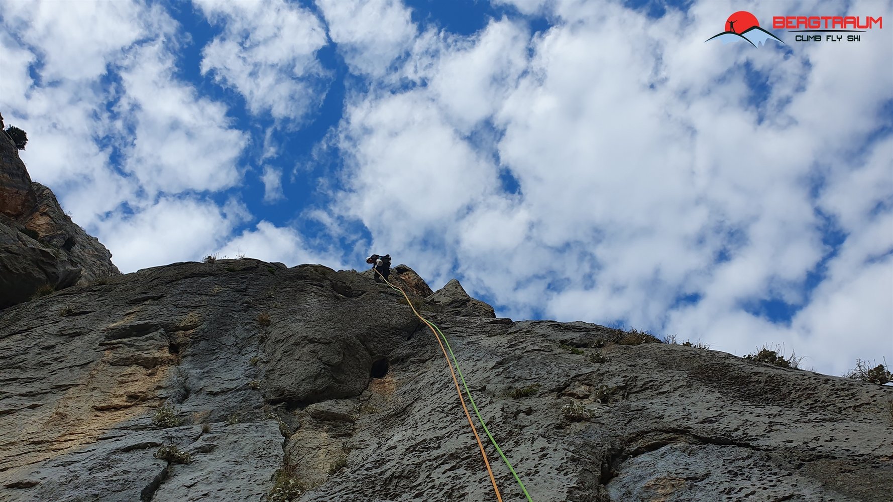 L7- 6a+: Markant nach rechts, dann schräg rechts hinauf, um eine Kante rum, dann wieder markant nach links und äußerst luftig senkrecht rauf zum Stand. Bis zum folgenden Abseiler im 2er Gelände für 40 Meter hinauf zum höchsten Punkt (Pfeil: „Abseil“).