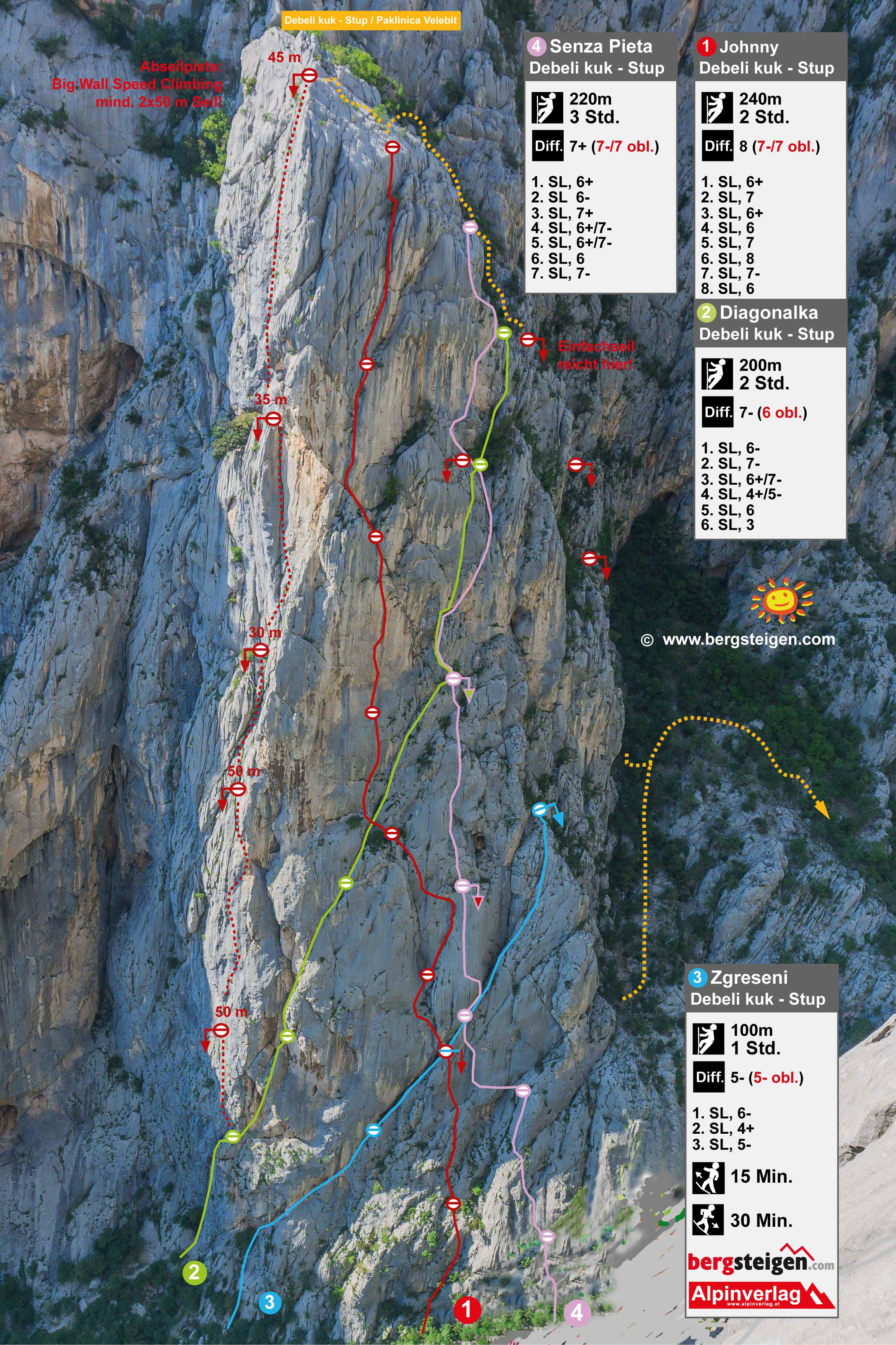 Entweder vom Gipfel orografisch links Richtung Norden absteigen bis zur roten Aufschrift: „Abseil“. Drei kurze Abseiler (Einfachseil reicht) bis zum Schotterfeld und weiter runter schwachen Steigspuren folgend zum Ausgangspunkt. Oder über die Route "big wall speed climbing" an der Südseite des debeli kuk in 5 SL abseilen (Doppelseil min. 50 m).