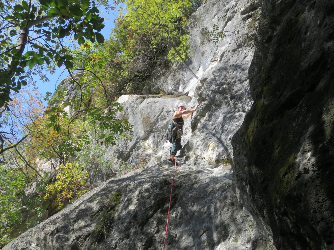 Zu Teil zwei steigt man zum Wanderweg auf und folgt diesem nach rechts bis man bei einer Lichtung die obere Wand sieht. Hier quert man zum Einstieg.