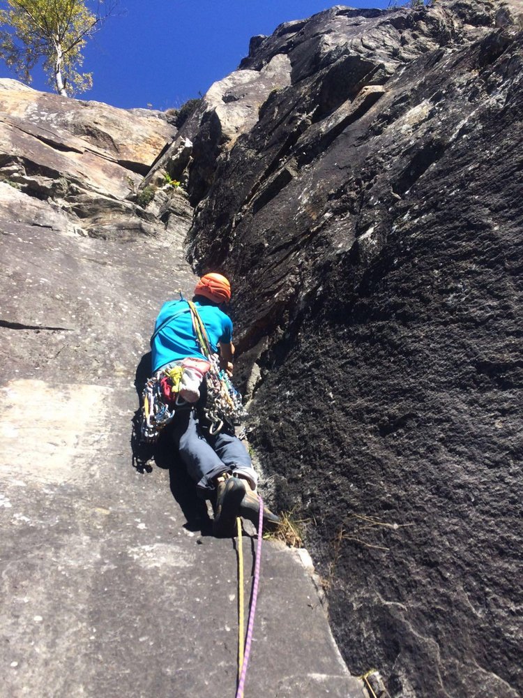 Stände gebohrt, ansonsten wenige BHs und Normalhaken als Zischensicherung. Der sichere Umgang mit Keilen und Cams ist daher pflicht.