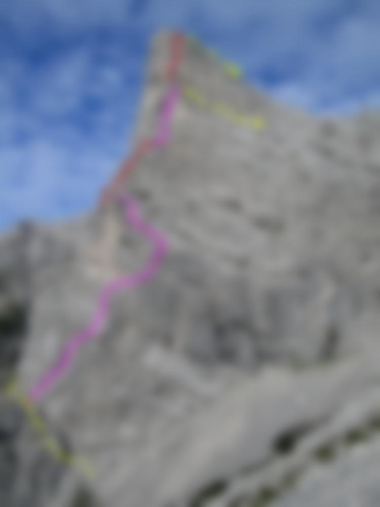 Im unteren Teil links (nördlich) der Kante, dann auf die rechte Kantenseite (westlich) wechseln bzw. immer ziemlich entlang der eigentlichen Kante (Pfeiler). Details siehe Topo