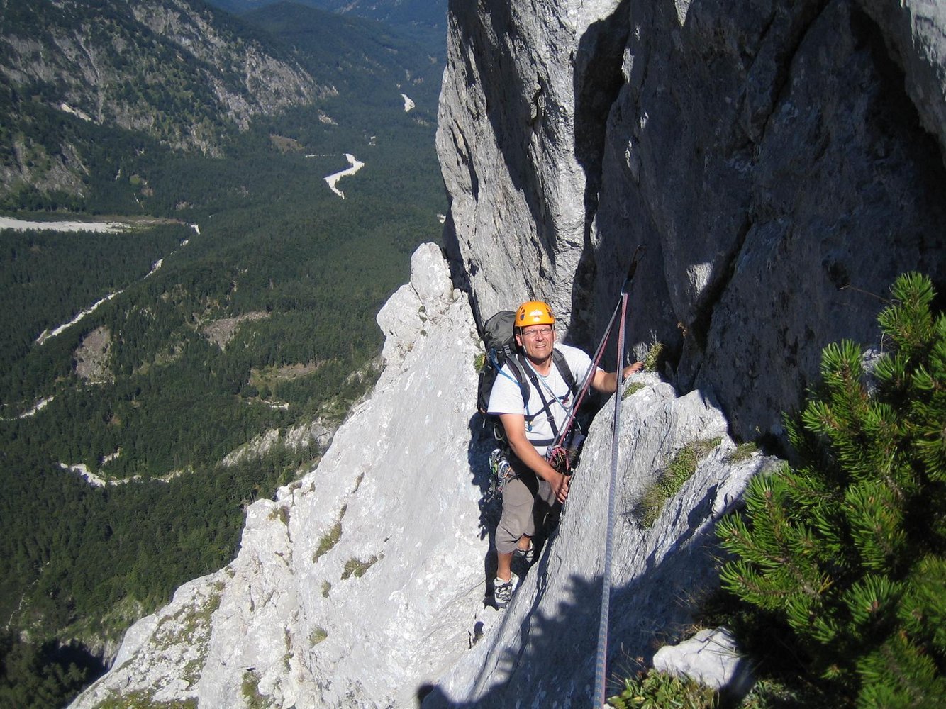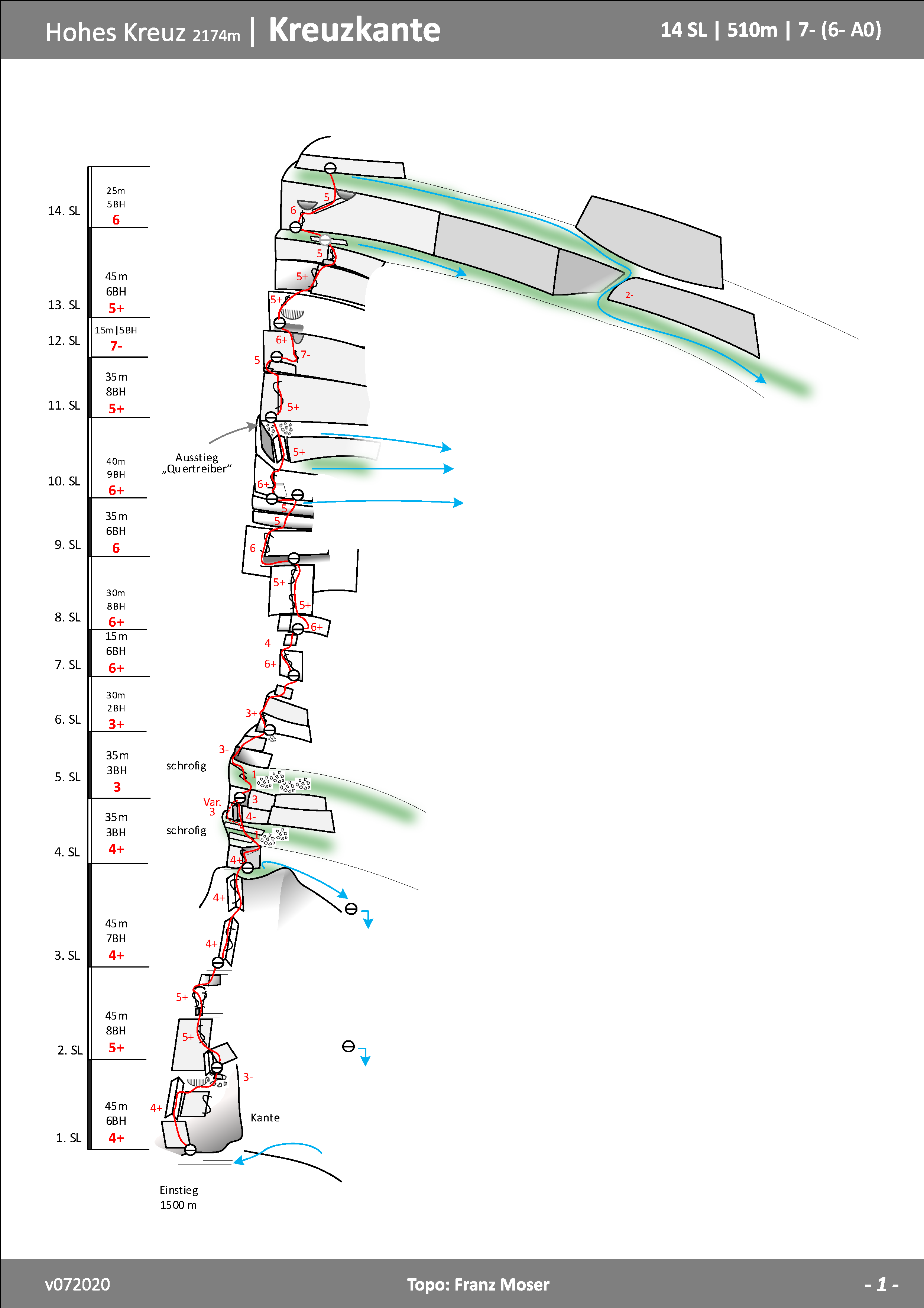 Durchwegs sehr gut mit Bohrhaken saniert, an den Ständen immer mindestens zwei Bohrhaken. Trotzdem bei weitem keine Plaisiertour, mobile Sicherungsmittel sind nich unbedingt notwendig, aber durchwegs gut anzubringen. Die Kletterschwierigkeiten können durch Hakenbenützung (A0) auf maximal 5+ gesenkt werden (dann eventuell vielleicht sogar Stellen A1 !?), 6- sollte man aber schon solide klettern können um in der Tour seine Freude zu haben. Die Kletterei ist im Allgemeinen recht anspruchsvoll für die jeweiligen Schwierigkeitsbewertungen!