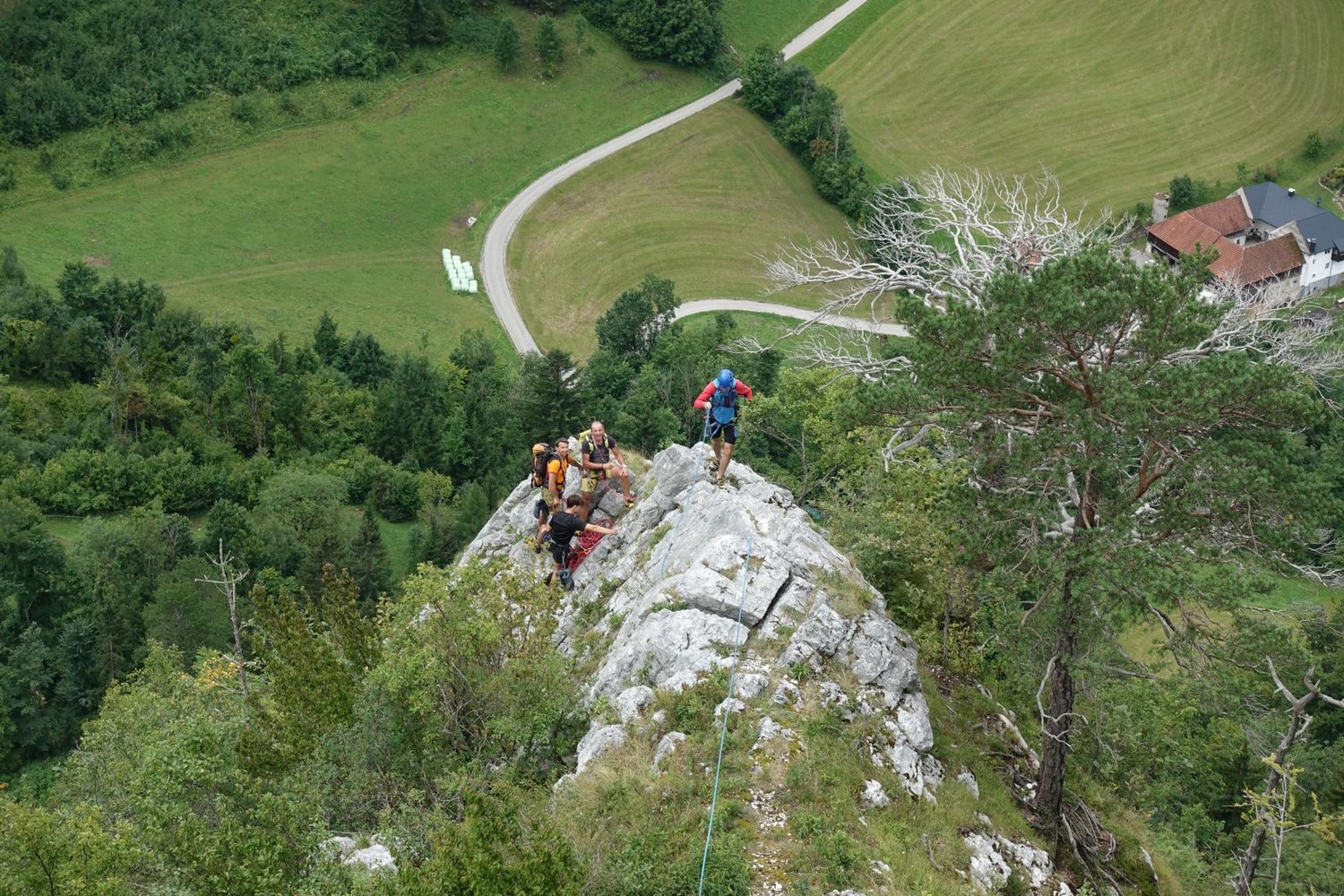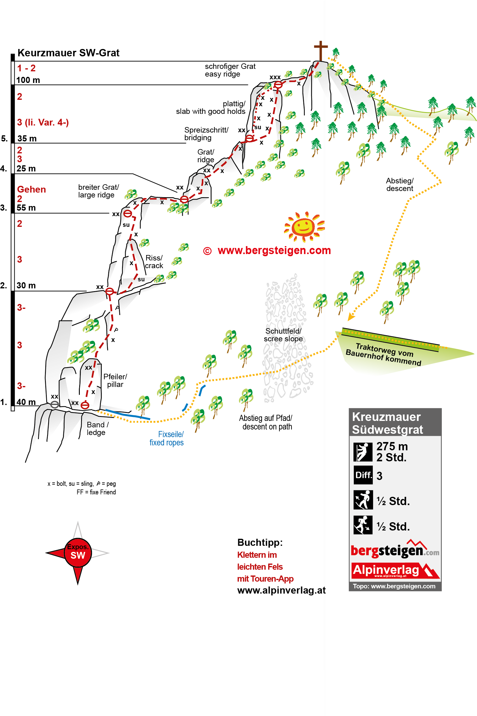 Nette Voralpen-Kletterei in überwiegend gutem Fels, die man dort nicht unbedingt erwarten würde. Überraschend fester Fels und teils luftige Kletterei über den Kreuzmauer Südwestgrat eingebettet in die liebliche Hügellandschaft des Ennstals. Zu empfehlen!