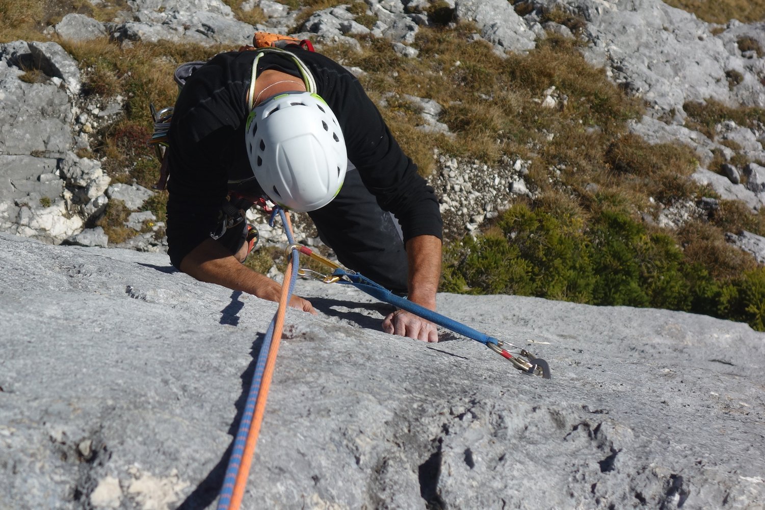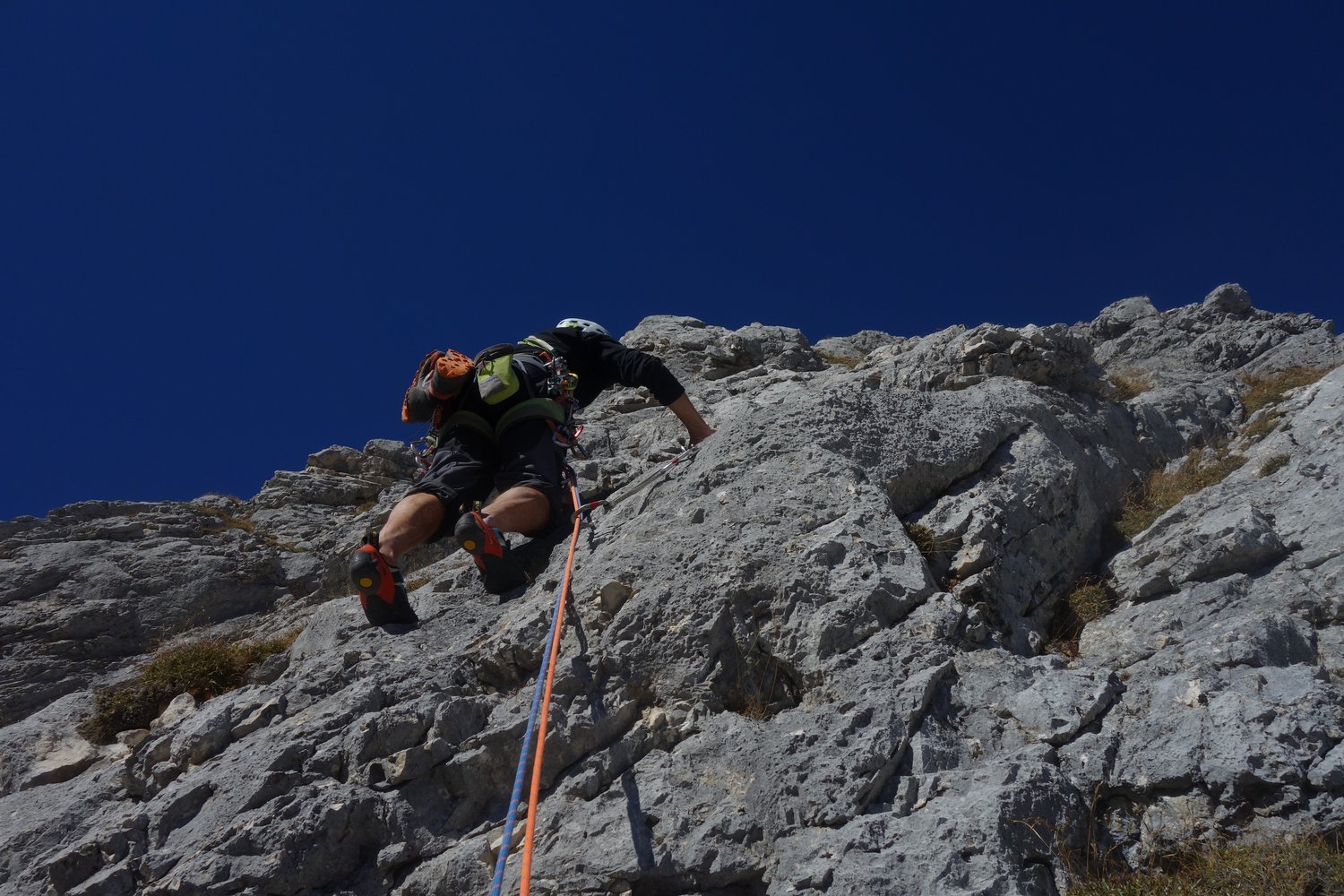 1. SL: Den herrlichen Piazriss gerade hinauf (6+, 6), kurz etwas leichter (5) und rechts zu einer Platte. Über diese (6/6+) zum Stand auf dem Absatz unter gelber Wand. (35 m, 6+, 10 BH)