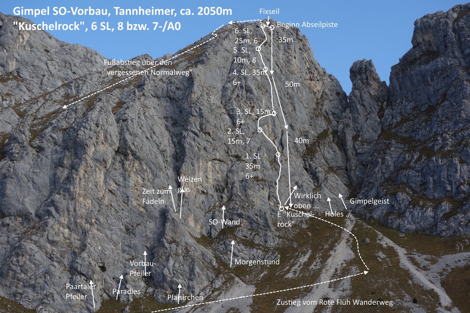 Die Kuschelrock am Gimpel ist eine überraschend raue Traumtour in sehr schönem, steilem und löchrigem Fels. Zusammen mit der sehr guten Absicherung und einem problemlosen Abstieg per Abseilen ergibt sich da oben die vielleicht schönste Tour in diesem Grad. Absolut empfehlenswert - sicher eines von Pats Meisterwerken!