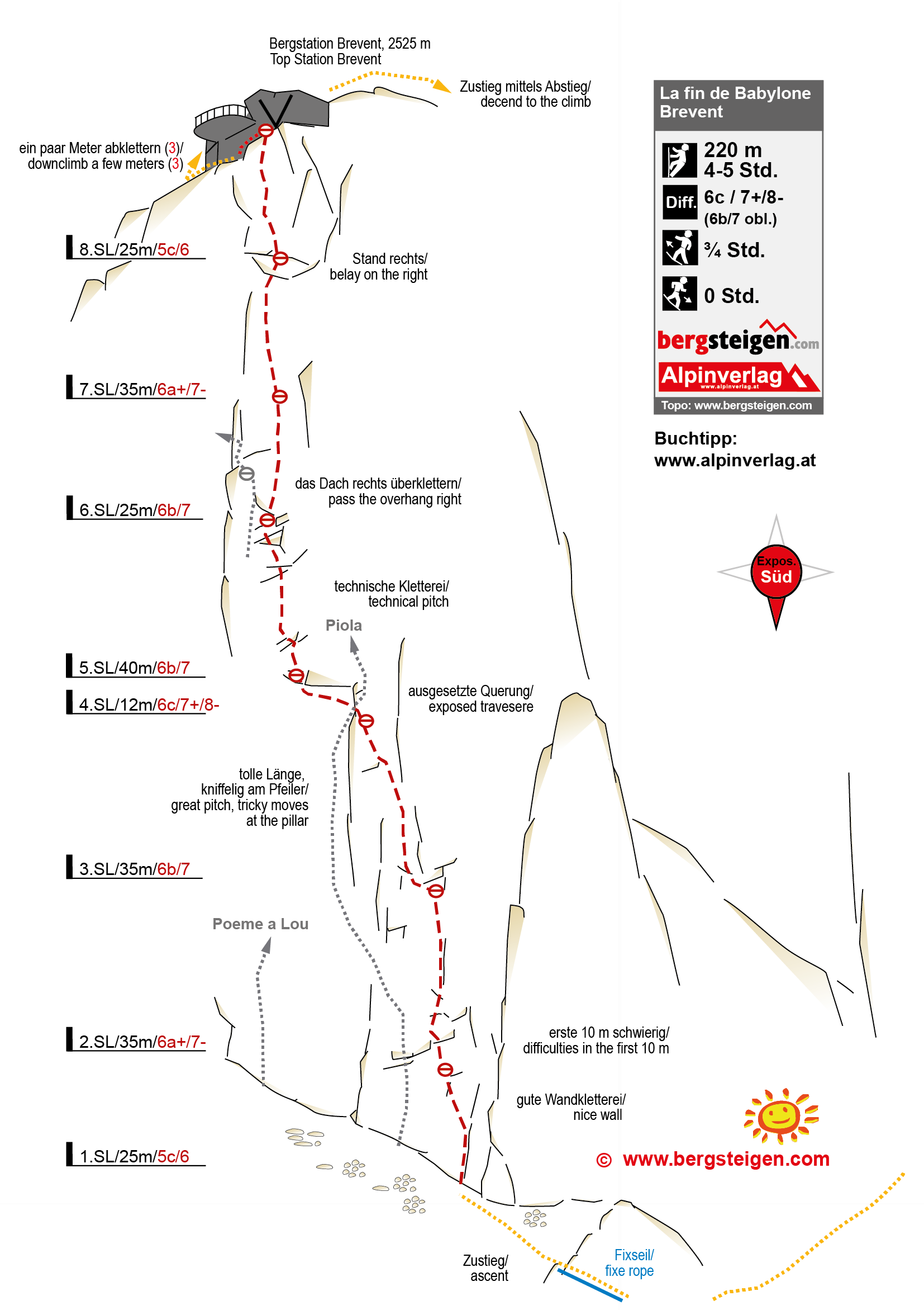 Vom Ausstieg ein paar Meter orografisch nach rechts abklettern (2-3) und in wenigen Schritten auf einem Pfad zur Bergstation.