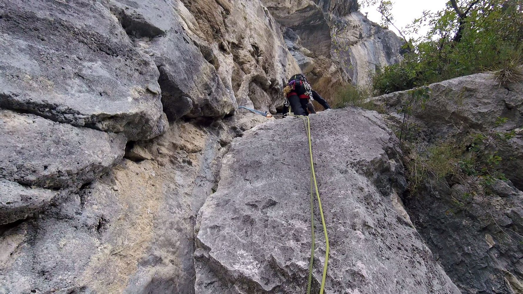 Gutmütige Alpintour ganz im Stil von Grill & Kluckner - einen Tick anspruchsvoller als die "Scalette dell' Indria". Die Route ist mit sehr vielen Sanduhren, einigen Normalhaken und Bohrhaken gesichert. Man könnte die Absicherung als "Gut" bezeichnen, aber kein Plaisir (im unteren 4ten Grad manchmal etwas weitere Abstände).