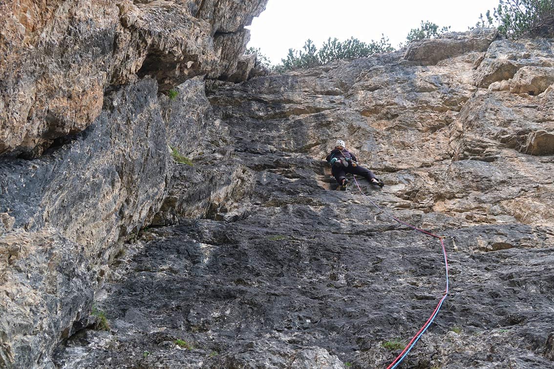 Die Route Prima volta di Martina ist ein Klassiker an den Südostwänden des Monte Popena Basso. Nach einer leichteren Einstiegsseillänge folgt schöne, griffige und am Ende leicht überhängende Kletterei - immer rechts der großen, gelben Riesenverschneidung. Am Ende noch ein kurzer, rustikaler Ausstiegs-Risskamin - das rundet das Dolomitenfeeling mit Drei-Zinnen-Blick perfekt ab.