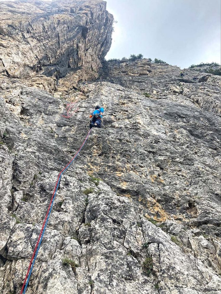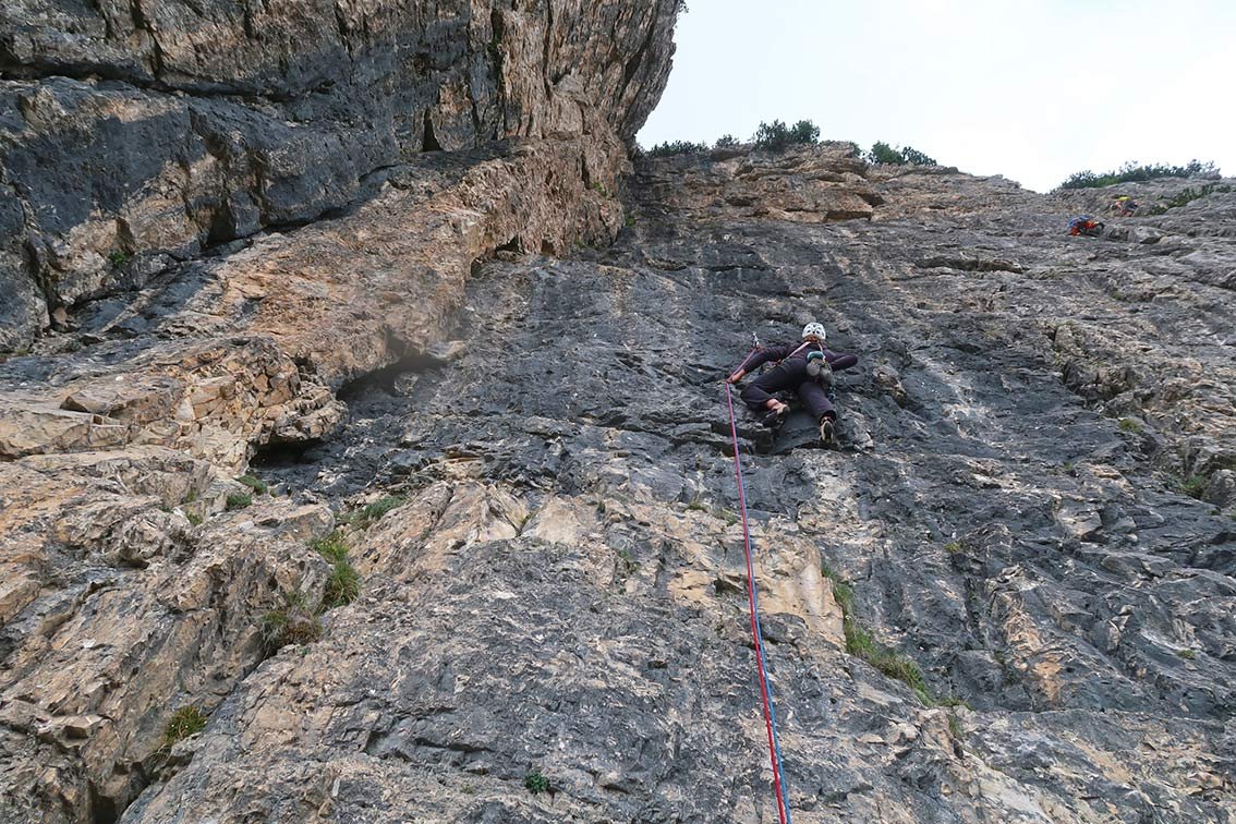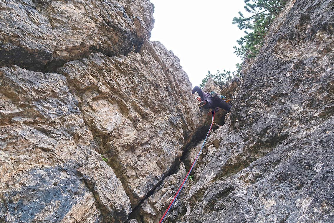 Der Ausstiegs-Risskamin gehört zur Zanutti-Verschneidung - die oben rechts verlaufende, brüchige Originalroute wird nicht mehr geklettert.