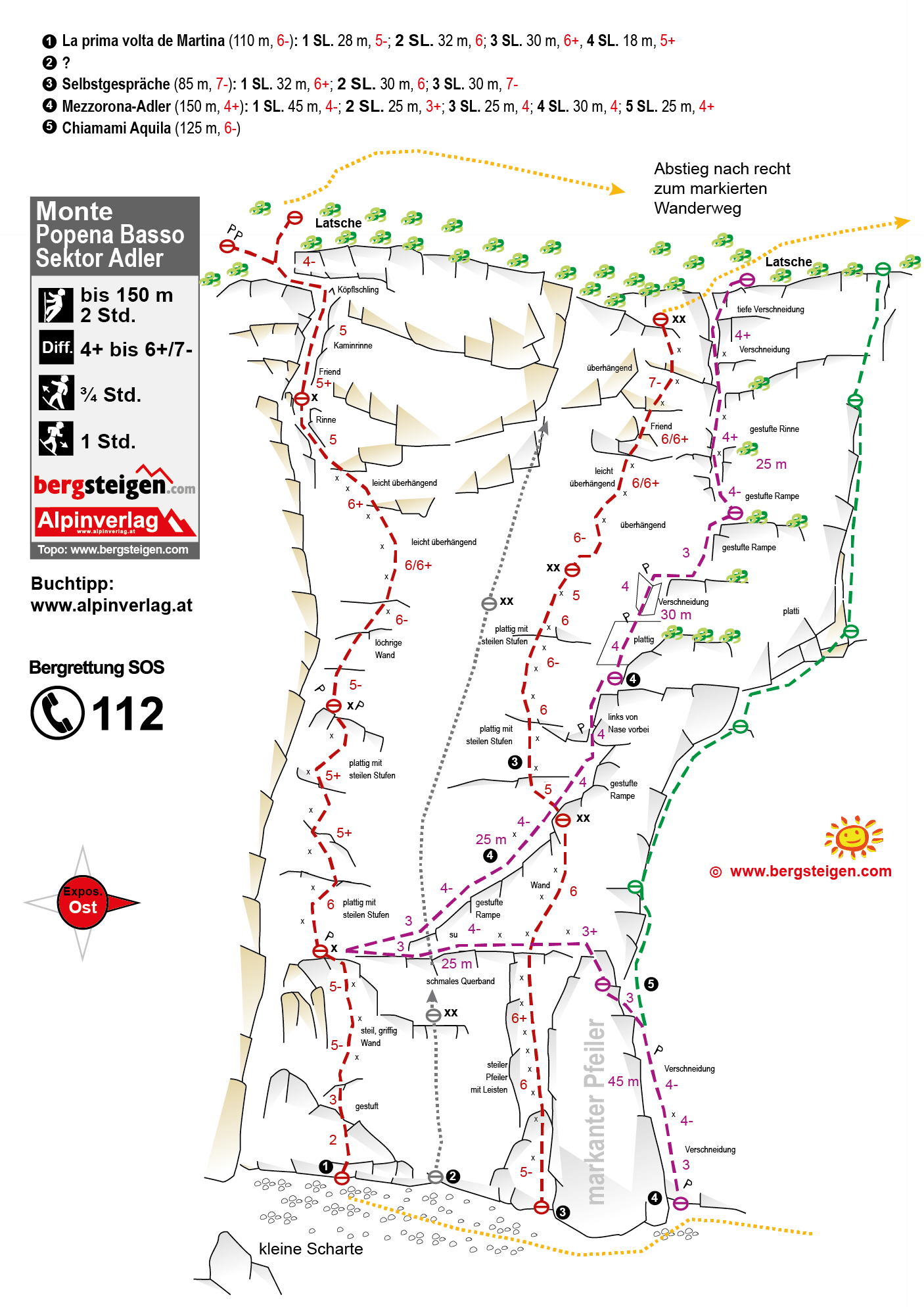 Vorm Ausstieg der Wand entlang nach Norden und über einen Steig zurück zum Wandfuß und auf dem schon bekannten Zustiegsweg hinunter zum Parkplatz. Siehe auch Übersichtsbild.