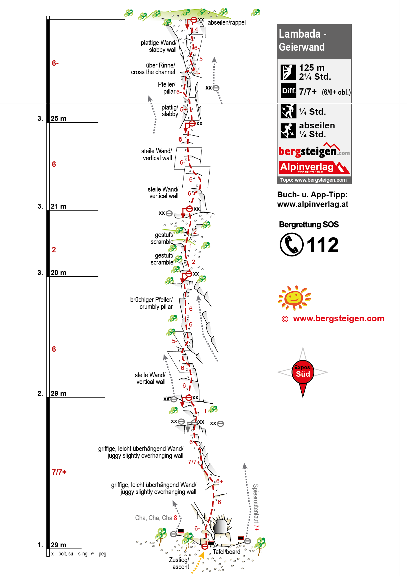Die Route Lambada war ursprünglich eine 1-Seillängen Sportkletterroute und wurde von Kurt Bubik bis hinauf auf das große Band verlängert. Vor allem die erste Seillänge ist ein absolutes Highlight (fast jeder Griff ist ein "Raster"), auch die anderen Seillängen sind im Großen und Ganzen lohnend. Die Route ist also trotz der schwierigen ersten Seillänge eine schöne Bereicherung für das Geierwand-Klettergebiet!