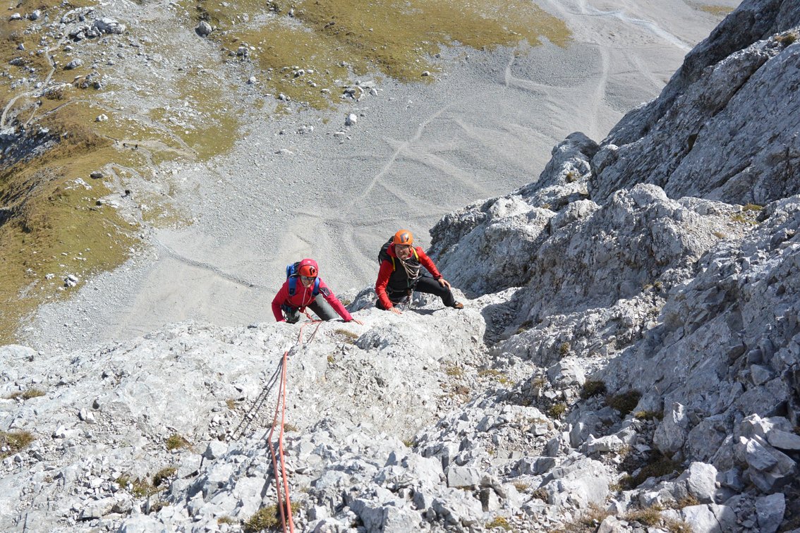 8. SL: Gerade über gestuftes Gelände zu BH, dort etwas rechts, dann gerade hinauf auf den Grat und weiter zum Gratkopf mit Standplatz.