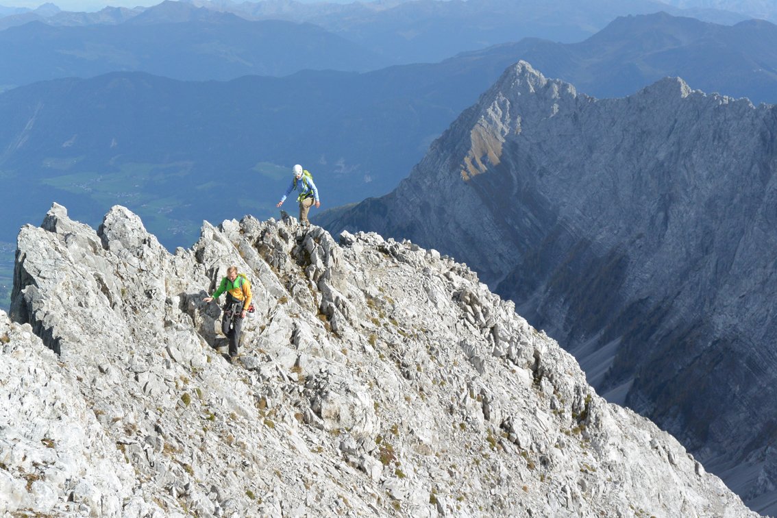 12. SL: Auf dem Grat abwärts (1- und Gehen) zu einem Pfeiler, dieser wird rechts ( nordseitig, lehmig) umgangen (BH direkt am Pfeiler, wer kein 60 m Seil hat, macht an diesem Haken Zwischenstand). Gleich beim Pfeiler über eine steile Stufe hinauf auf den gestuften Grat, auf diesem zum Gipfelkreuz des Vorgipfels ( Ende der Klettertour).