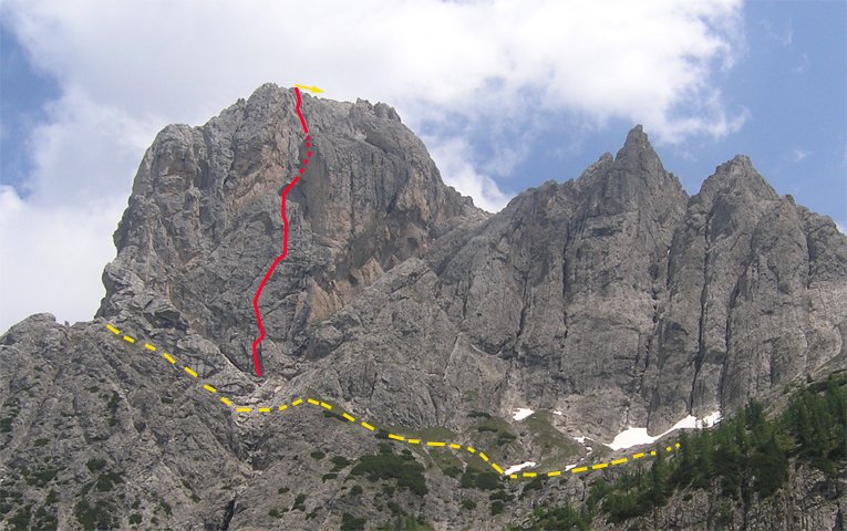 Vom Parkplatz Dolomitenhütte dem beschilderten Steig zur Karlsbaderhütte folgen, nach halber Wegstrecke in Richtung Laserzwand abbiegen und über Steig zur Westschlucht (Alternative – „Rudl-Eller-Weg“). Ca. 50 Meter über die Schlucht hinauf, dann links über die die Rampe in Richtung Kantenköpfl. Einstieg links von der markanten Verschneidung.