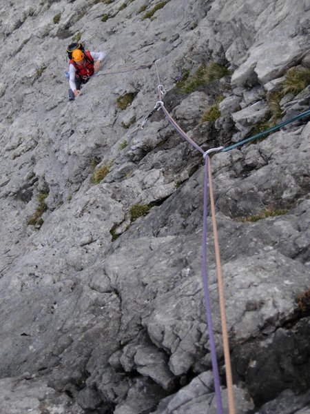 Alle Stand- und Zwischenhaken sind vorhanden (Bohrhaken, M10 Seil 50 Meter, 8 Expressschlingen, Schlingen u. kleines KKSortiment (mittlere Friends).