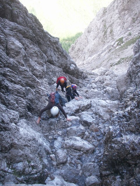 Über Grat rechts haltend (östlich) zum Gipfel, über Steig zur Karlsbaderhütte und weiter zur Dolomitenhütte (1,5 Stunden).