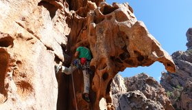 Die Route folgt Rissen, Tafonis und kurzen Wandstellen. Sie ist sehr gut absicherbar, an den wenigen nicht absicherbaren Stellen wurden insgesamt 3 Bolts gesetzt. Auch die Stände sind gebohrt.