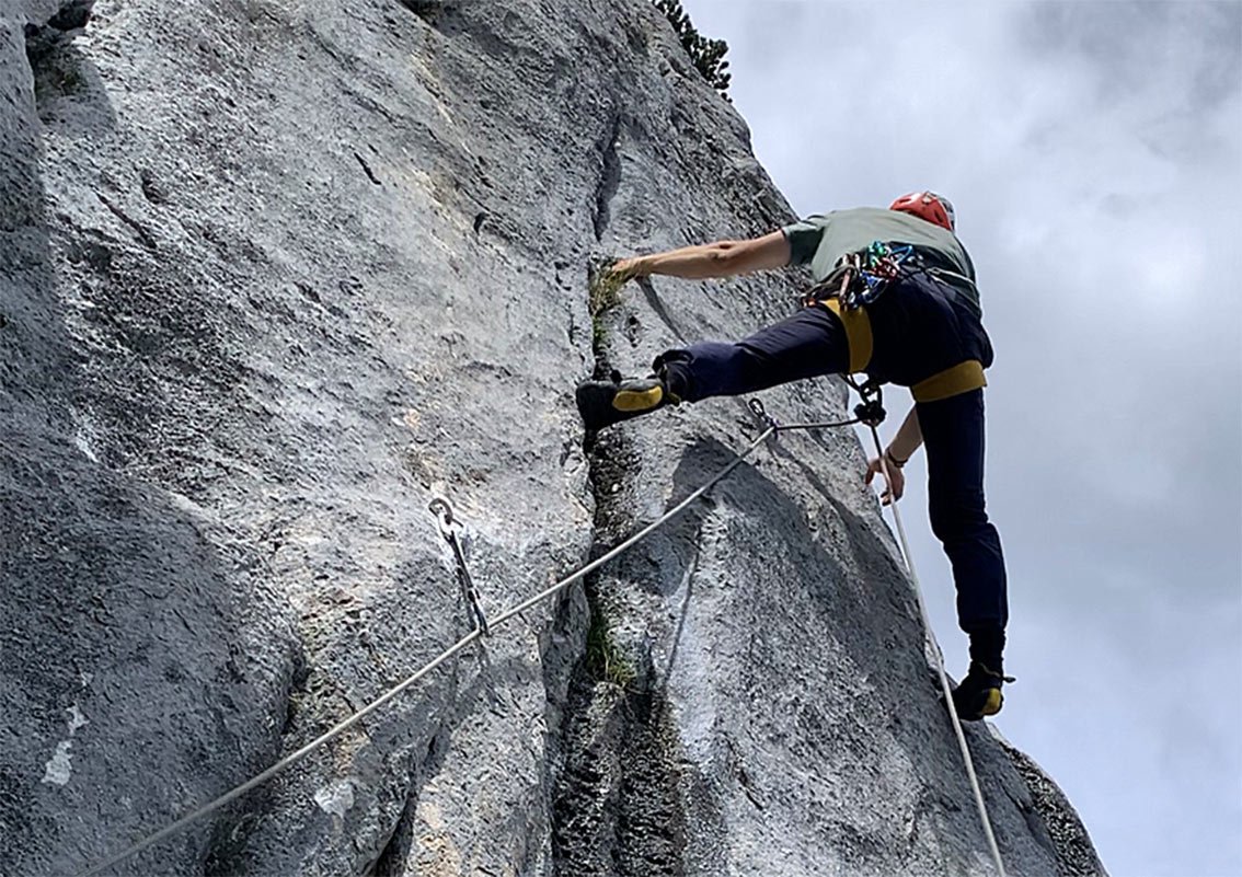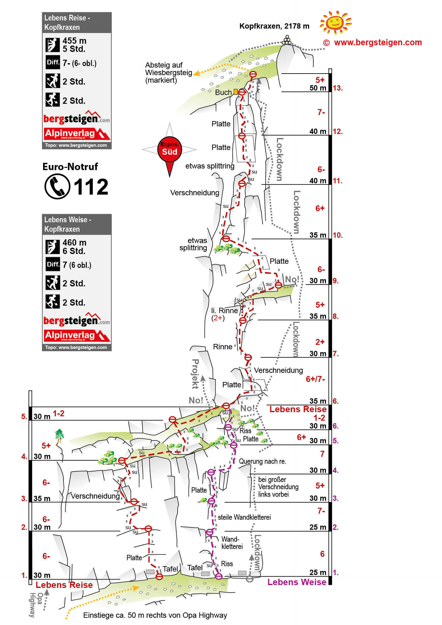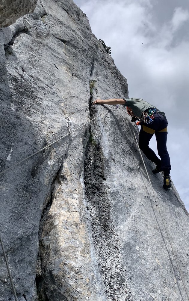 Alpine Sportkletter Route mit apinem Charakter! Die Route "Lebens Weise" ist der neue Direkteinstieg der Route Lebens Reise. Die Route ist schöner zu klettern als der linke Originaleinstieg. Die Route hat mehrere Highlights so wie der ausgesetzte Quergang in der 4SL oder der markante Pfeiler in der Mitte (sehr cool). Der Fels ist gut, aber auch manchmal splittrig. Die Route ist noch sehr neu, deshalb kann der eine oder andere Griff oder Tritt locker sein!