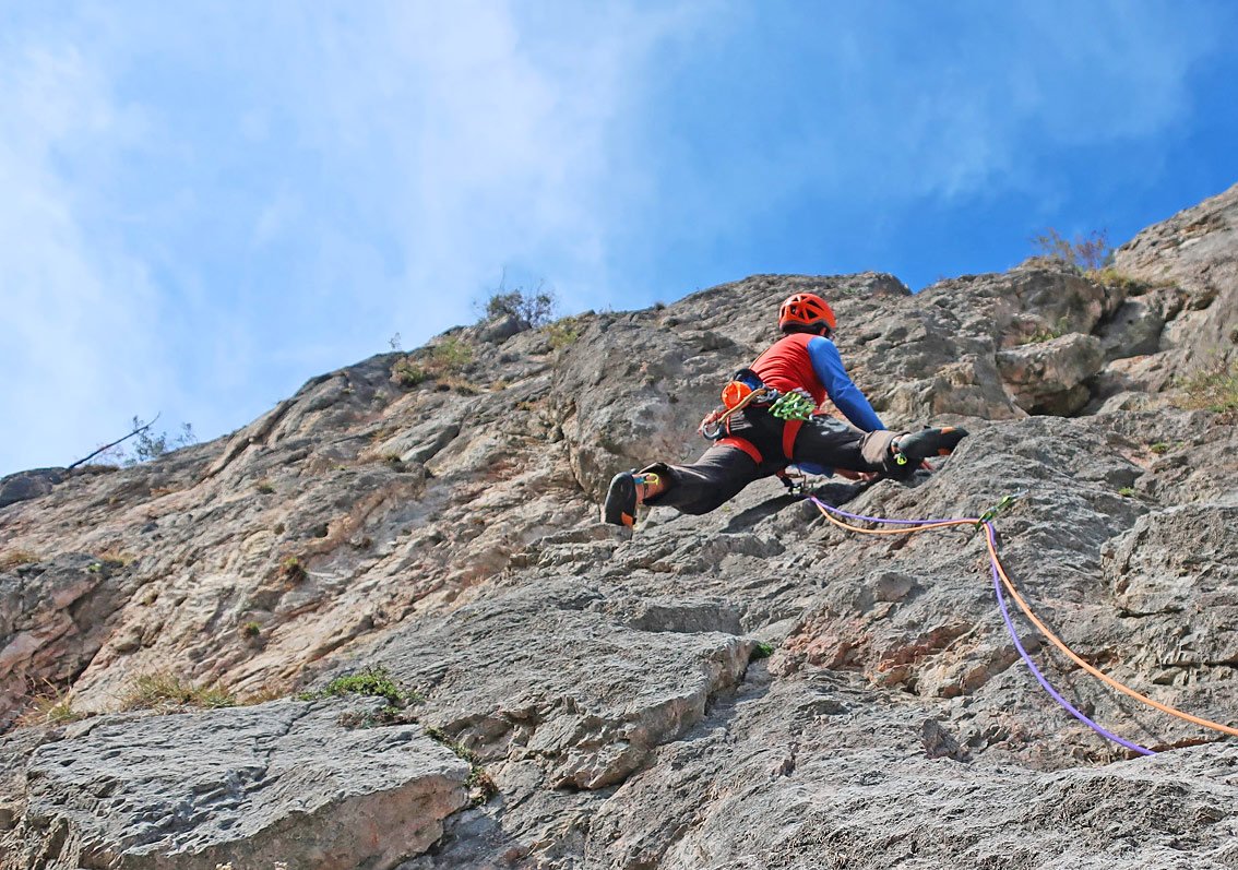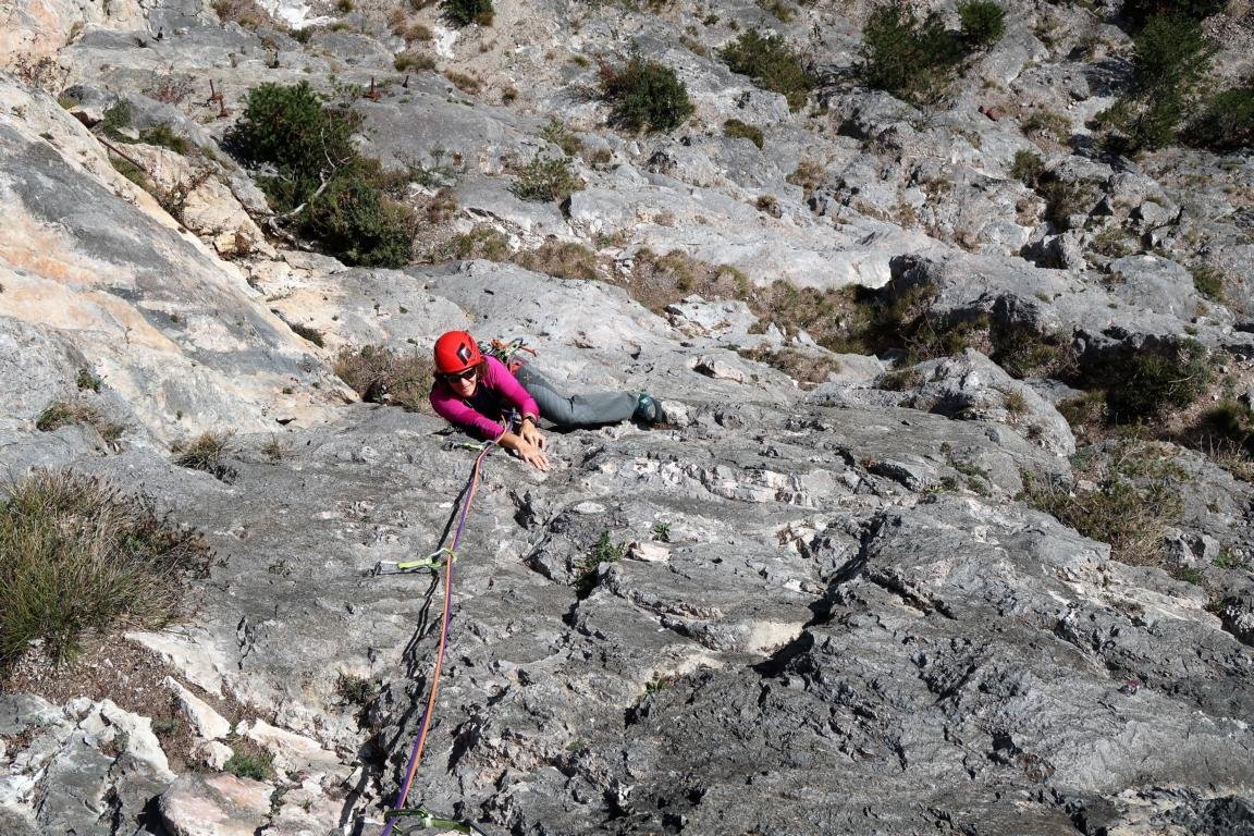Gut mit Bohrhaken abgesichert, einizig in der ersten Seillänge und im leichten Gelände etwas größere Abstände.