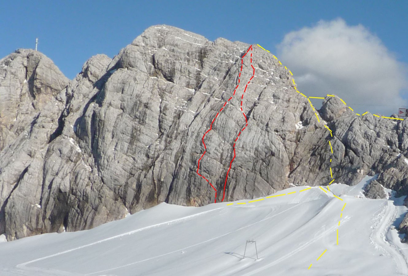 Leichte Tour an der Nordwand des Kleinen Koppenkarstein. Die Tour ist aber nicht, wie im Führer beschrieben, eine Anfängertour. Die ersten Seillängen zeichnen sich durch steile, tolle Plattenkletterei aus, selten klettert man einen so kompakten 4er.