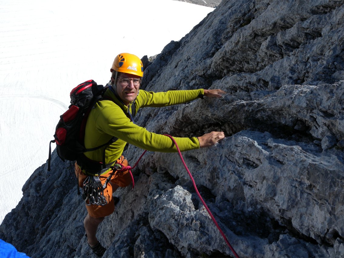 Wenn nach einem weitere Seillschaften in die Wand einsteigen, ist im oberen Wandteil Steinschlag vermeiden. Die Tour verlangen solides Klettern im 4ten Grat.