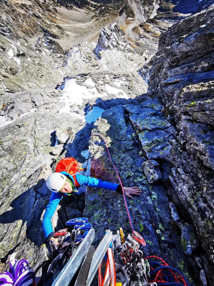 Begeisternde und lohnende alpine Kletterei entlang von Rissen, Platten und Gratkanten auf größtenteils sehr festen Gestein.