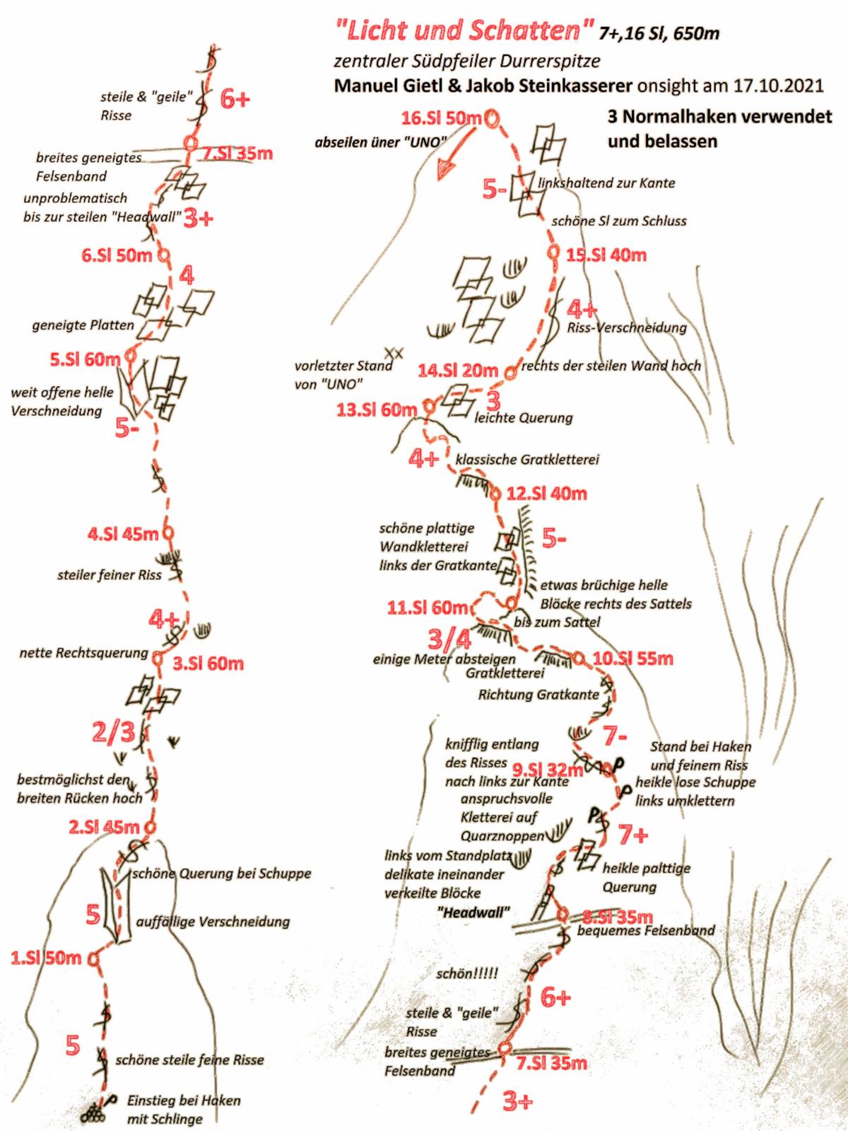 Mitte Oktober herrschten perfekte Bedingungen, um ein weiteres Mal am beinahe perfekten Antholzer Tonalit Hand anzulegen. Unser auserwähltes Ziel war dieses Mal der lange, bereits vom Biathlon Zentrum gut einsehbare zentrale Südpfeiler der Durrerspitze. Möglichst logisch und klassisch wollten wir an diesem Gratpfeiler eine Route eröffnen. Die steile "Headwall" nach gut der Hälfte des Pfeilers wollten wir ebenso in eine so weit wie möglich klassische alpine Route einbinden. Das Timing konnte am 17.Oktober kaum besser sein. Genau zum Sonnenaufgang standen wir an der markanten Pfeilerkante, die frühmorgens den Sonnenstrahlen die Gelegenheit bot, um unheimlich eindrucksvolle Lichtspiele zu veranstalten. An einem auffälligen Band entschlossen wir, einzusteigen. Die ersten zwei Seillängen boten ansehnliche steile griffige Riss- und Verschneidungskletterei. Nach einem kurzen etwas grasigen Intermezzo in der dritten Seillänge kletterten wir stets der lohnenswertesten Linie entlang direkt unter die steile und aufällige "Headwall". Diese bot traumhafte steile Wandkletterei entlang feiner Risse und Schuppen. An einigen Stellen fühlte man sich beinahe "priviligiert" an solch makellos schönen Risse die mobilen Sicherungen anzbringen. Nach gut zwei Drittel des Pfeilers kletterten wir ungefähr zwei Seillängen direkt an der Gratkante. Linien- bzw. Routenführung ist dort sicherlich recht großzügig auszulegen. Möglichts logisch ging es schlussendlich entlang toller Felsstrukturen auf den Gipfelsporn der Durrerspitze. Dort angelangt, seilten wir schließlich über die Route "UNO" an eingerichten Standplatzen wieder ab. Eine tolle, recht lohnenswerte und empfehlenswerte Route war geboren. Da wir nur drei haken verwendeten und beließen ist die Routenfindung an einigen Stellen sicherlich nicht ganz einfach. Lässt man seiner Intuition und alpinen Instinkt freien Lauf und genießt das Legen mobiler Sicherung, kommt man sicherlich voll auf seine Kosten und schlussendlich auf den sehr seten besuchten Gipfelsporn der Durrerspitze.