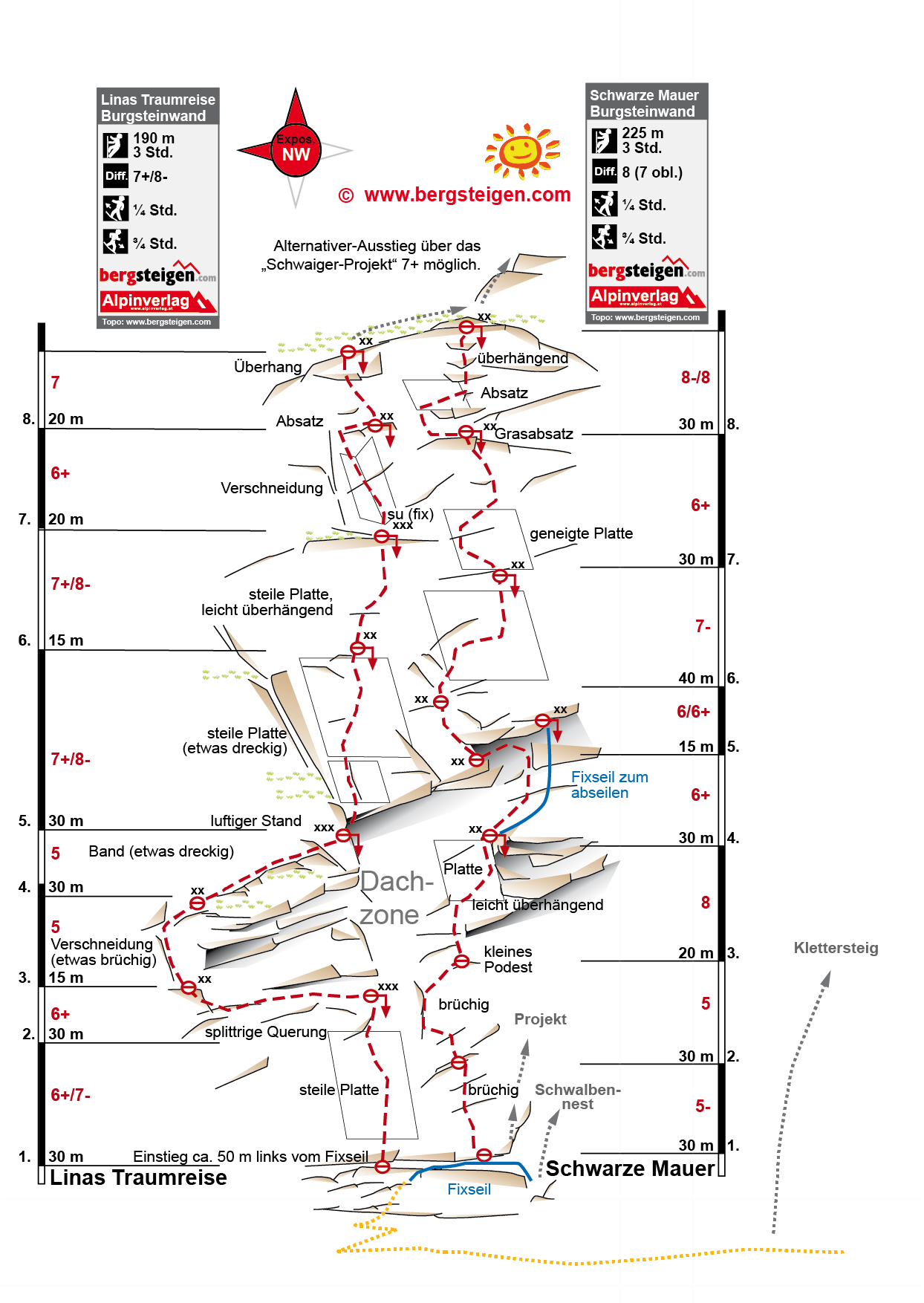 Am Ende der Route abseilen (siehe Topo). Alternativ kann man links den sog. "Schwaiger-Projekt" Ausstieg (7+) nehmen.