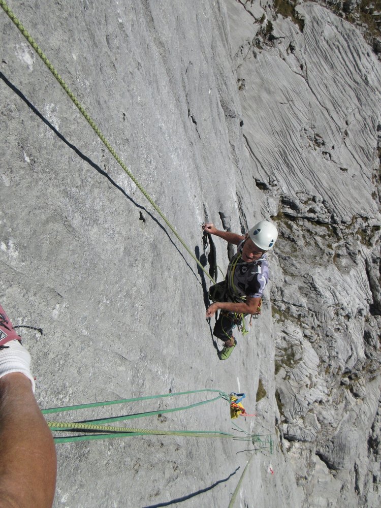 Alpine Sportkletterroute, wobei an wenigen Stellen zusätzlich mobile Geräte gelegt werden können/müssen..
